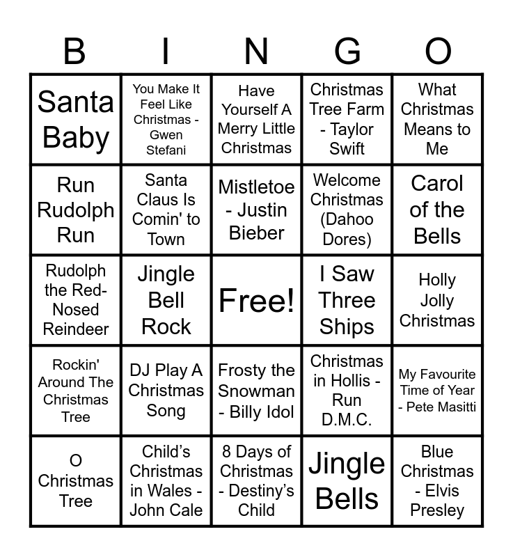 This bingo card has a free space and 97 words: It Came Upon A Midnight Clear, Thank God It's Christmas - Queen, Christmas Wrapping - The Waitresses, Jingle Bell Rock, Fairytale of New York - The Pogues, Sleigh Ride, Christmas Without You - Ava Max, Six Cups of Eggnog - Larry Costa, Grown-Up Christmas List - Amy Grant, The Christmas Song (Merry Christmas to You), Merry Christmas Happy Holidays - *NSYNC, Wishlist - The Ready Set, Holiday Road - Kesha, Rockin' Around The Christmas Tree, Oh It’s Christmas! - Jordan Sparks, Santa Baby, What Christmas Means to Me, This December - Ricky Montgomery, Last Christmas, Domnick the Donkey - Lou Monte, We Are The World - U.S.A. For Africa, Little Drummer Boy, Little Saint Nick - The Beach Boys, Silent Night, The Holly and the Ivy, Mistletoe - Justin Bieber, O Christmas Tree, My Favourite Time of Year - Pete Masitti, Silver Bells, One More Sleep - Leona Lewis, Santa Claus Is Comin' to Town, Christmas Tree Farm - Taylor Swift, Angels We Have Heard on High, Hallelujah - Leonard Cohen, 8 Days of Christmas - Destiny’s Child, Frosty the Snowman - Billy Idol, Christmas Lights - Coldplay, O Holy Night - Céline Dion, I Wish It Could Be Christmas Everyday, Rudolph the Red-Nosed Reindeer, Please Come Home for Christmas - Eagles, Holly Jolly Christmas, O Come All Ye Faithful - Pentatonix, Jingle Bells, DJ Play A Christmas Song, Here Comes Santa Claus, All I Want for Christmas Is You, Christmas Time Is Here, Away In a Manger, ELF - Main theme, Christmas Don’t Be Late (Chipmunk Song), Let It Snow! Let It Snow! Let It Snow!, It’s a Marshmallow World - Jo Stafford, We Three Kings - Dolly Parton, Feliz Navidad - José Feliciano, A Nonsense Christmas - Sabrina Carpenter, Drunk On Christmas - Darren Criss, You Make It Feel Like Christmas - Gwen Stefani, Merry Christmas - Ed Sheeran, Ode to Joy - Beethoven, Underneath the Tree - Kelly Clarkson, It’s Beginning to Look a Lot Like Christmas, ¿Dónde Está Santa Claus? - Augie Rios, Do You Hear What I Hear? - Whitney Houstin, Joy to the World, I’m Gettin Nuttin for Christmas, My Only Wish (This Year) - Britney Spears, It’s the Most Wonderful Time of the Year, Step Into Christmas - Elton John, Child’s Christmas in Wales - John Cale, Welcome Christmas (Dahoo Dores), That Old Christmas Moon - Leon Redbone, Christmas (Baby Please Come Home) - Darlene Love, Winter Wonderland, Cozy Little Christmas - Katy Perry, Wonderful Christmastime, Driving Home For Christmas - Chris Rea, Happy Holidays, I Saw Three Ships, Santa Tell Me - Ariana Grande, Snowman - Sia, Carol of the Bells, God Rest Ye Merry Gentlemen, Joyful Joyful We Adore Thee, Good King Wenceslas - Jennifer Jones, White Christmas - Bing Crosby, Blue Christmas - Elvis Presley, I Saw Mommy Kissing Santa Claus, 2000 Miles - The Pretenders, Christmas Rappin’ - Kurtis Blow, Have Yourself A Merry Little Christmas, I’ll Be Home - Meghan Trainor, The Nutcracker Suite, Christmas in Hollis - Run D.M.C., Run Rudolph Run, Hark! The Angels Sing and Happy Xmas (War Is Over).