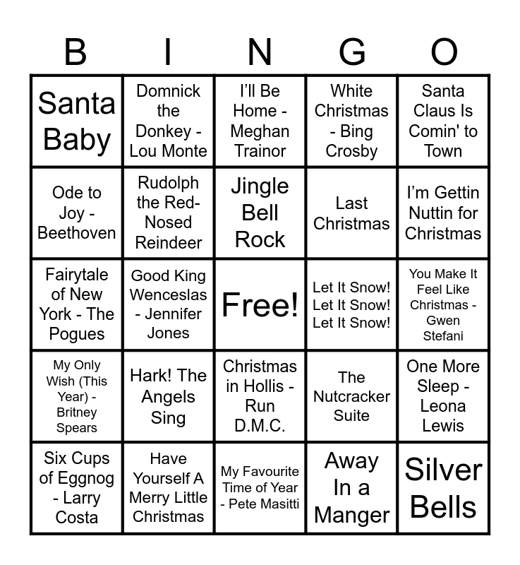 This bingo card has a free space and 97 words: 8 Days of Christmas - Destiny’s Child, Wishlist - The Ready Set, We Three Kings - Dolly Parton, Good King Wenceslas - Jennifer Jones, That Old Christmas Moon - Leon Redbone, O Come All Ye Faithful - Pentatonix, Little Drummer Boy, Here Comes Santa Claus, ELF - Main theme, Christmas (Baby Please Come Home) - Darlene Love, Drunk On Christmas - Darren Criss, Run Rudolph Run, Christmas Wrapping - The Waitresses, My Only Wish (This Year) - Britney Spears, DJ Play A Christmas Song, Santa Baby, Santa Claus Is Comin' to Town, It’s Beginning to Look a Lot Like Christmas, Christmas Tree Farm - Taylor Swift, Santa Tell Me - Ariana Grande, Happy Holidays, O Christmas Tree, Christmas Lights - Coldplay, 2000 Miles - The Pretenders, What Christmas Means to Me, Jingle Bell Rock, Six Cups of Eggnog - Larry Costa, One More Sleep - Leona Lewis, Holiday Road - Kesha, Christmas Time Is Here, Rudolph the Red-Nosed Reindeer, White Christmas - Bing Crosby, Christmas Rappin’ - Kurtis Blow, Carol of the Bells, My Favourite Time of Year - Pete Masitti, Christmas in Hollis - Run D.M.C., We Are The World - U.S.A. For Africa, Wonderful Christmastime, Happy Xmas (War Is Over), Fairytale of New York - The Pogues, Little Saint Nick - The Beach Boys, You Make It Feel Like Christmas - Gwen Stefani, Winter Wonderland, Away In a Manger, Hark! The Angels Sing, It Came Upon A Midnight Clear, Frosty the Snowman - Billy Idol, I Saw Three Ships, The Christmas Song (Merry Christmas to You), Oh It’s Christmas! - Jordan Sparks, Do You Hear What I Hear? - Whitney Houstin, It’s a Marshmallow World - Jo Stafford, Step Into Christmas - Elton John, Grown-Up Christmas List - Amy Grant, Snowman - Sia, Joyful Joyful We Adore Thee, Jingle Bells, Domnick the Donkey - Lou Monte, Merry Christmas - Ed Sheeran, Underneath the Tree - Kelly Clarkson, The Holly and the Ivy, Christmas Don’t Be Late (Chipmunk Song), I Wish It Could Be Christmas Everyday, Christmas Without You - Ava Max, I Saw Mommy Kissing Santa Claus, Holly Jolly Christmas, Driving Home For Christmas - Chris Rea, Thank God It's Christmas - Queen, ¿Dónde Está Santa Claus? - Augie Rios, Have Yourself A Merry Little Christmas, Last Christmas, A Nonsense Christmas - Sabrina Carpenter, Sleigh Ride, Cozy Little Christmas - Katy Perry, Please Come Home for Christmas - Eagles, It’s the Most Wonderful Time of the Year, Silent Night, Joy to the World, Let It Snow! Let It Snow! Let It Snow!, Hallelujah - Leonard Cohen, Angels We Have Heard on High, I’m Gettin Nuttin for Christmas, Mistletoe - Justin Bieber, Welcome Christmas (Dahoo Dores), This December - Ricky Montgomery, All I Want for Christmas Is You, Silver Bells, Rockin' Around The Christmas Tree, God Rest Ye Merry Gentlemen, Blue Christmas - Elvis Presley, I’ll Be Home - Meghan Trainor, Feliz Navidad - José Feliciano, Child’s Christmas in Wales - John Cale, The Nutcracker Suite, Ode to Joy - Beethoven, Merry Christmas Happy Holidays - *NSYNC and O Holy Night - Céline Dion.
