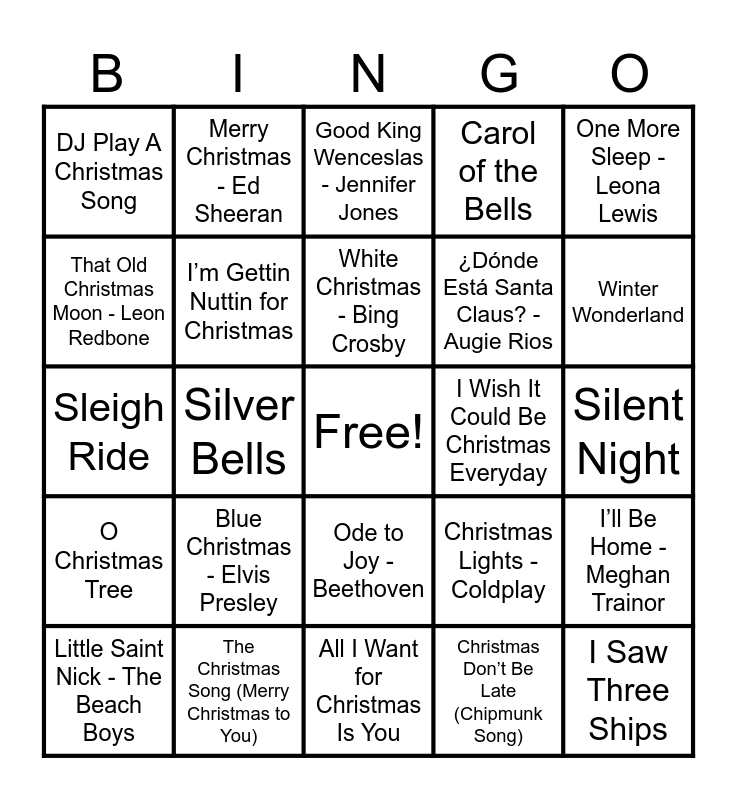 This bingo card has a free space and 97 words: Christmas Tree Farm - Taylor Swift, Holiday Road - Kesha, Oh It’s Christmas! - Jordan Sparks, Silver Bells, Joy to the World, Let It Snow! Let It Snow! Let It Snow!, Christmas in Hollis - Run D.M.C., Happy Holidays, Run Rudolph Run, It’s Beginning to Look a Lot Like Christmas, Jingle Bell Rock, Step Into Christmas - Elton John, Rudolph the Red-Nosed Reindeer, O Christmas Tree, Here Comes Santa Claus, DJ Play A Christmas Song, One More Sleep - Leona Lewis, Away In a Manger, It Came Upon A Midnight Clear, Please Come Home for Christmas - Eagles, Merry Christmas Happy Holidays - *NSYNC, Snowman - Sia, Happy Xmas (War Is Over), Have Yourself A Merry Little Christmas, It’s the Most Wonderful Time of the Year, White Christmas - Bing Crosby, Little Saint Nick - The Beach Boys, I’ll Be Home - Meghan Trainor, Drunk On Christmas - Darren Criss, A Nonsense Christmas - Sabrina Carpenter, I’m Gettin Nuttin for Christmas, Carol of the Bells, The Nutcracker Suite, Grown-Up Christmas List - Amy Grant, All I Want for Christmas Is You, Ode to Joy - Beethoven, What Christmas Means to Me, Christmas Time Is Here, Rockin' Around The Christmas Tree, Sleigh Ride, You Make It Feel Like Christmas - Gwen Stefani, Silent Night, Santa Baby, Christmas Don’t Be Late (Chipmunk Song), Blue Christmas - Elvis Presley, We Three Kings - Dolly Parton, Child’s Christmas in Wales - John Cale, My Only Wish (This Year) - Britney Spears, Domnick the Donkey - Lou Monte, God Rest Ye Merry Gentlemen, Angels We Have Heard on High, Hallelujah - Leonard Cohen, O Holy Night - Céline Dion, Hark! The Angels Sing, Do You Hear What I Hear? - Whitney Houstin, Wishlist - The Ready Set, The Holly and the Ivy, Merry Christmas - Ed Sheeran, Thank God It's Christmas - Queen, Underneath the Tree - Kelly Clarkson, 8 Days of Christmas - Destiny’s Child, I Saw Mommy Kissing Santa Claus, Little Drummer Boy, Welcome Christmas (Dahoo Dores), Holly Jolly Christmas, Christmas Wrapping - The Waitresses, My Favourite Time of Year - Pete Masitti, Fairytale of New York - The Pogues, Feliz Navidad - José Feliciano, The Christmas Song (Merry Christmas to You), ¿Dónde Está Santa Claus? - Augie Rios, Six Cups of Eggnog - Larry Costa, Christmas Without You - Ava Max, Christmas (Baby Please Come Home) - Darlene Love, Santa Claus Is Comin' to Town, O Come All Ye Faithful - Pentatonix, Christmas Rappin’ - Kurtis Blow, 2000 Miles - The Pretenders, I Wish It Could Be Christmas Everyday, Frosty the Snowman - Billy Idol, Mistletoe - Justin Bieber, Winter Wonderland, This December - Ricky Montgomery, Last Christmas, We Are The World - U.S.A. For Africa, Cozy Little Christmas - Katy Perry, I Saw Three Ships, Wonderful Christmastime, It’s a Marshmallow World - Jo Stafford, ELF - Main theme, Good King Wenceslas - Jennifer Jones, Santa Tell Me - Ariana Grande, Jingle Bells, Christmas Lights - Coldplay, That Old Christmas Moon - Leon Redbone, Joyful Joyful We Adore Thee and Driving Home For Christmas - Chris Rea.