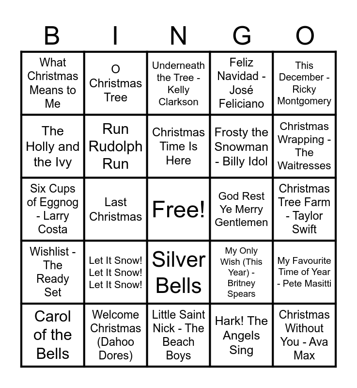 This bingo card has a free space and 97 words: 2000 Miles - The Pretenders, Ode to Joy - Beethoven, Santa Claus Is Comin' to Town, Last Christmas, Please Come Home for Christmas - Eagles, Domnick the Donkey - Lou Monte, 8 Days of Christmas - Destiny’s Child, Hallelujah - Leonard Cohen, Blue Christmas - Elvis Presley, White Christmas - Bing Crosby, Good King Wenceslas - Jennifer Jones, The Christmas Song (Merry Christmas to You), ¿Dónde Está Santa Claus? - Augie Rios, Wishlist - The Ready Set, Santa Baby, What Christmas Means to Me, This December - Ricky Montgomery, A Nonsense Christmas - Sabrina Carpenter, DJ Play A Christmas Song, Angels We Have Heard on High, Drunk On Christmas - Darren Criss, Wonderful Christmastime, Christmas (Baby Please Come Home) - Darlene Love, All I Want for Christmas Is You, I Wish It Could Be Christmas Everyday, Christmas Time Is Here, Carol of the Bells, My Favourite Time of Year - Pete Masitti, Snowman - Sia, Child’s Christmas in Wales - John Cale, Run Rudolph Run, Feliz Navidad - José Feliciano, Grown-Up Christmas List - Amy Grant, It’s a Marshmallow World - Jo Stafford, Little Saint Nick - The Beach Boys, Silver Bells, Happy Holidays, The Nutcracker Suite, Merry Christmas - Ed Sheeran, Six Cups of Eggnog - Larry Costa, Merry Christmas Happy Holidays - *NSYNC, Christmas Tree Farm - Taylor Swift, It’s the Most Wonderful Time of the Year, Hark! The Angels Sing, Let It Snow! Let It Snow! Let It Snow!, Cozy Little Christmas - Katy Perry, Thank God It's Christmas - Queen, Silent Night, ELF - Main theme, We Three Kings - Dolly Parton, Little Drummer Boy, I Saw Mommy Kissing Santa Claus, Christmas Rappin’ - Kurtis Blow, That Old Christmas Moon - Leon Redbone, Christmas Don’t Be Late (Chipmunk Song), Rockin' Around The Christmas Tree, Jingle Bell Rock, O Christmas Tree, Joyful Joyful We Adore Thee, Joy to the World, Holly Jolly Christmas, O Holy Night - Céline Dion, Here Comes Santa Claus, I Saw Three Ships, You Make It Feel Like Christmas - Gwen Stefani, It’s Beginning to Look a Lot Like Christmas, Santa Tell Me - Ariana Grande, Happy Xmas (War Is Over), Winter Wonderland, Welcome Christmas (Dahoo Dores), Frosty the Snowman - Billy Idol, Christmas Lights - Coldplay, Sleigh Ride, Step Into Christmas - Elton John, Have Yourself A Merry Little Christmas, Holiday Road - Kesha, I’ll Be Home - Meghan Trainor, O Come All Ye Faithful - Pentatonix, God Rest Ye Merry Gentlemen, We Are The World - U.S.A. For Africa, It Came Upon A Midnight Clear, Christmas Wrapping - The Waitresses, Fairytale of New York - The Pogues, Rudolph the Red-Nosed Reindeer, Mistletoe - Justin Bieber, Driving Home For Christmas - Chris Rea, Christmas Without You - Ava Max, I’m Gettin Nuttin for Christmas, Away In a Manger, Oh It’s Christmas! - Jordan Sparks, Underneath the Tree - Kelly Clarkson, One More Sleep - Leona Lewis, Jingle Bells, My Only Wish (This Year) - Britney Spears, The Holly and the Ivy, Do You Hear What I Hear? - Whitney Houstin and Christmas in Hollis - Run D.M.C..