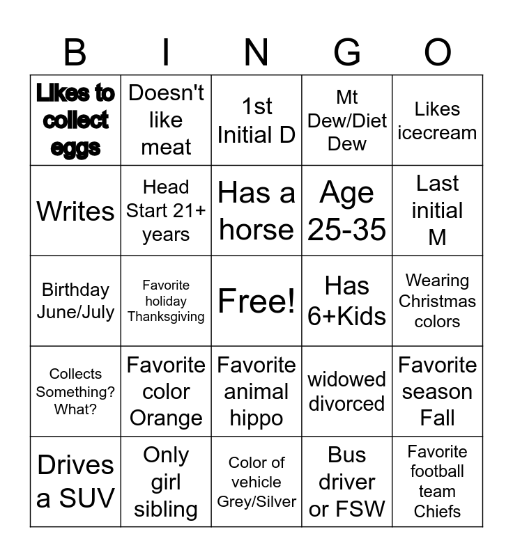 This bingo card has a free space and 24 words: Favorite color Orange, Only girl sibling, Has a horse, Drives a SUV, Likes icecream, Likes to collect eggs, Writes, Doesn't like meat, Has 6+Kids, Favorite animal hippo, Age 25-35, Birthday June/July, widowed divorced, Favorite season Fall, Head Start 21+ years, Bus driver or FSW, Wearing Christmas colors, 1st Initial D, Last initial M, Favorite holiday Thanksgiving, Favorite football team Chiefs, Collects Something? What?, Mt Dew/Diet Dew and Color of vehicle Grey/Silver.
