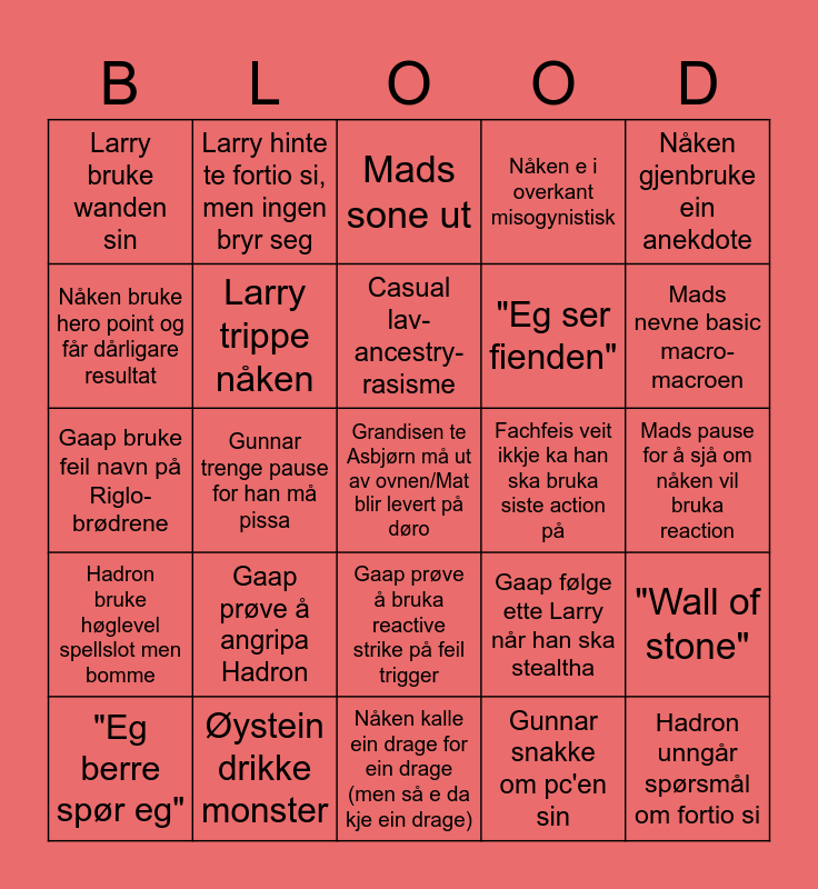 This bingo card has 25 words: Gaap prøve å angripa Hadron, Nåken kalle ein drage for ein drage (men så e da kje ein drage), Casual lav-ancestry-rasisme, "Eg berre spør eg", Nåken gjenbruke ein anekdote, Larry bruke wanden sin, Nåken bruke hero point og får dårligare resultat, Larry hinte te fortio si, men ingen bryr seg, Fachfeis veit ikkje ka han ska bruka siste action på, Gaap prøve å bruka reactive strike på feil trigger, "Eg ser fienden", Gaap bruke feil navn på Riglo-brødrene, Gaap følge ette Larry når han ska stealtha, "Wall of stone", Larry trippe nåken, Hadron unngår spørsmål om fortio si, Mads pause for å sjå om nåken vil bruka reaction, Mads sone ut, Mads nevne basic macro-macroen, Gunnar trenge pause for han må pissa, Grandisen te Asbjørn må ut av ovnen/Mat blir levert på døro, Øystein drikke monster, Hadron bruke høglevel spellslot men bomme, Nåken e i overkant misogynistisk and Gunnar snakke om pc'en sin.