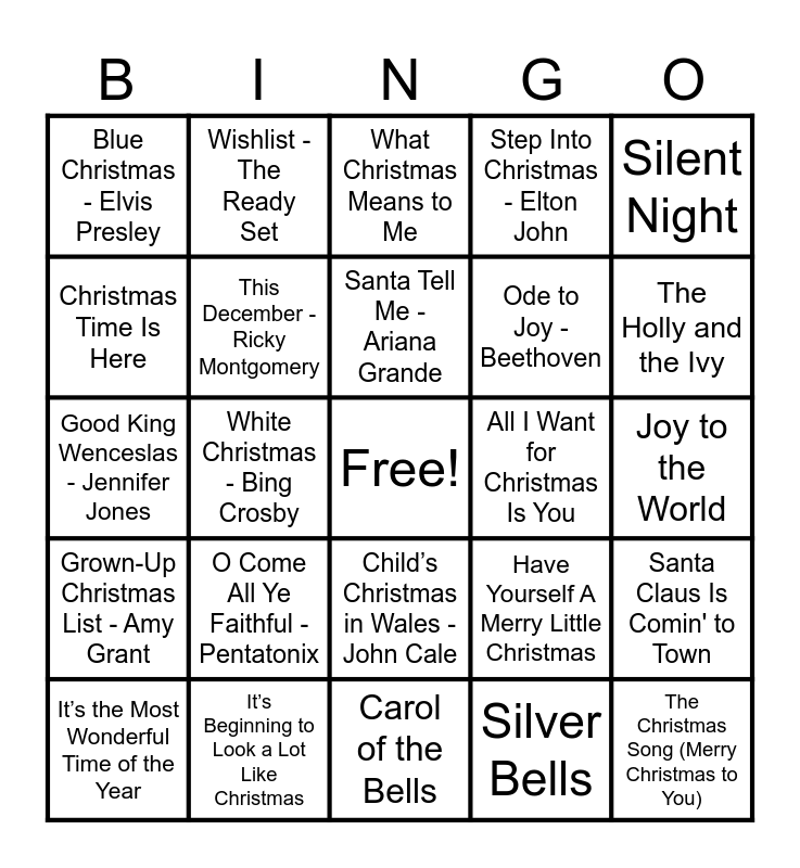 This bingo card has a free space and 97 words: God Rest Ye Merry Gentlemen, Sleigh Ride, Wonderful Christmastime, White Christmas - Bing Crosby, The Nutcracker Suite, My Only Wish (This Year) - Britney Spears, Happy Holidays, It’s a Marshmallow World - Jo Stafford, ELF - Main theme, Christmas (Baby Please Come Home) - Darlene Love, We Three Kings - Dolly Parton, Christmas Wrapping - The Waitresses, I Wish It Could Be Christmas Everyday, Grown-Up Christmas List - Amy Grant, I’ll Be Home - Meghan Trainor, Blue Christmas - Elvis Presley, Silent Night, Rudolph the Red-Nosed Reindeer, Christmas Don’t Be Late (Chipmunk Song), Underneath the Tree - Kelly Clarkson, Hallelujah - Leonard Cohen, DJ Play A Christmas Song, Christmas in Hollis - Run D.M.C., Snowman - Sia, Jingle Bell Rock, Santa Tell Me - Ariana Grande, It’s the Most Wonderful Time of the Year, Santa Claus Is Comin' to Town, Christmas Lights - Coldplay, Hark! The Angels Sing, This December - Ricky Montgomery, Step Into Christmas - Elton John, Frosty the Snowman - Billy Idol, Please Come Home for Christmas - Eagles, Carol of the Bells, Child’s Christmas in Wales - John Cale, I’m Gettin Nuttin for Christmas, Away In a Manger, I Saw Mommy Kissing Santa Claus, Good King Wenceslas - Jennifer Jones, Winter Wonderland, Joy to the World, You Make It Feel Like Christmas - Gwen Stefani, Silver Bells, O Come All Ye Faithful - Pentatonix, A Nonsense Christmas - Sabrina Carpenter, Little Saint Nick - The Beach Boys, Christmas Without You - Ava Max, O Christmas Tree, Little Drummer Boy, Thank God It's Christmas - Queen, Do You Hear What I Hear? - Whitney Houstin, Holly Jolly Christmas, Christmas Rappin’ - Kurtis Blow, Mistletoe - Justin Bieber, Happy Xmas (War Is Over), Oh It’s Christmas! - Jordan Sparks, Wishlist - The Ready Set, Feliz Navidad - José Feliciano, We Are The World - U.S.A. For Africa, My Favourite Time of Year - Pete Masitti, Welcome Christmas (Dahoo Dores), Joyful Joyful We Adore Thee, Fairytale of New York - The Pogues, Merry Christmas Happy Holidays - *NSYNC, Christmas Tree Farm - Taylor Swift, 8 Days of Christmas - Destiny’s Child, Santa Baby, Domnick the Donkey - Lou Monte, It’s Beginning to Look a Lot Like Christmas, Ode to Joy - Beethoven, Merry Christmas - Ed Sheeran, 2000 Miles - The Pretenders, I Saw Three Ships, One More Sleep - Leona Lewis, Jingle Bells, It Came Upon A Midnight Clear, Drunk On Christmas - Darren Criss, All I Want for Christmas Is You, Rockin' Around The Christmas Tree, O Holy Night - Céline Dion, The Holly and the Ivy, Last Christmas, Run Rudolph Run, ¿Dónde Está Santa Claus? - Augie Rios, Six Cups of Eggnog - Larry Costa, The Christmas Song (Merry Christmas to You), Here Comes Santa Claus, Cozy Little Christmas - Katy Perry, Angels We Have Heard on High, What Christmas Means to Me, Let It Snow! Let It Snow! Let It Snow!, Holiday Road - Kesha, Have Yourself A Merry Little Christmas, Christmas Time Is Here, Driving Home For Christmas - Chris Rea and That Old Christmas Moon - Leon Redbone.