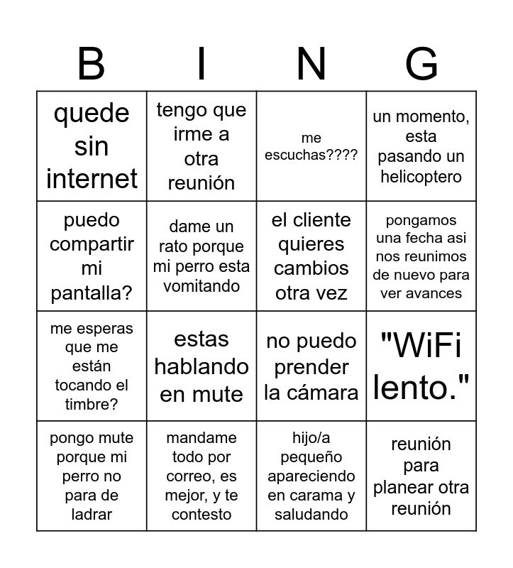 This bingo card has 16 words: mandame todo por correo, es mejor, y te contesto, "WiFi lento.", me escuchas????, quede sin internet, me esperas que me están tocando el timbre?, tengo que irme a otra reunión, no puedo prender la cámara, hijo/a pequeño apareciendo en carama y saludando, puedo compartir mi pantalla?, dame un rato porque mi perro esta vomitando, pongo mute porque mi perro no para de ladrar, un momento, esta pasando un helicoptero, estas hablando en mute, pongamos una fecha asi nos reunimos de nuevo para ver avances, el cliente quieres cambios otra vez and reunión para planear otra reunión.