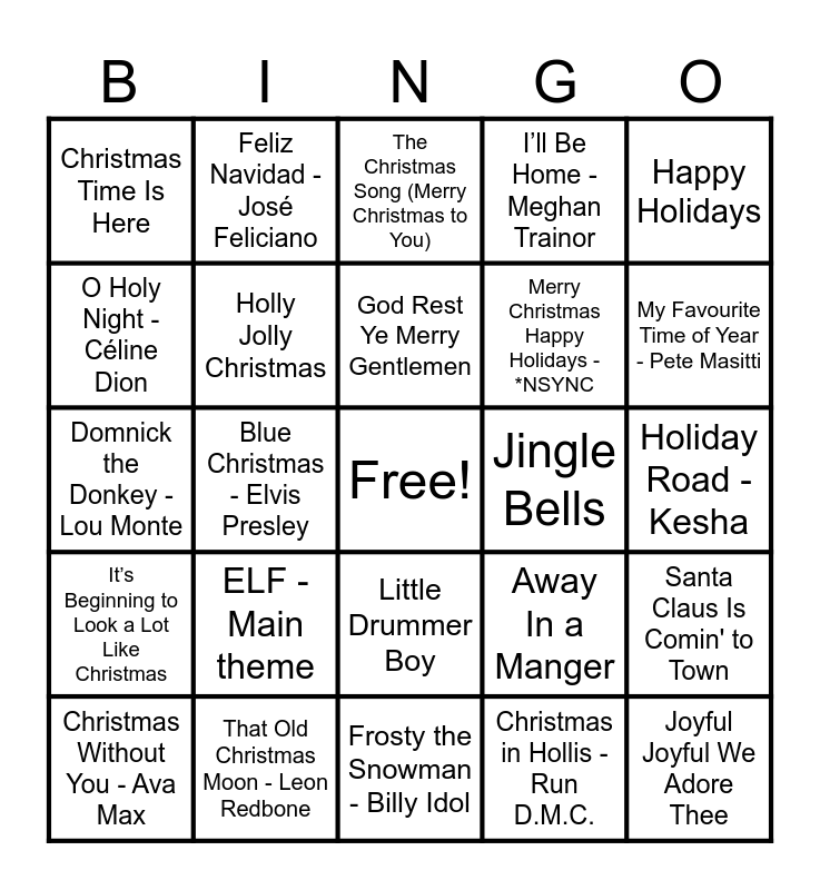 This bingo card has a free space and 97 words: Here Comes Santa Claus, Hark! The Angels Sing, Cozy Little Christmas - Katy Perry, Blue Christmas - Elvis Presley, A Nonsense Christmas - Sabrina Carpenter, Christmas (Baby Please Come Home) - Darlene Love, Joy to the World, I Saw Mommy Kissing Santa Claus, Thank God It's Christmas - Queen, It’s a Marshmallow World - Jo Stafford, Oh It’s Christmas! - Jordan Sparks, Carol of the Bells, Ode to Joy - Beethoven, It’s Beginning to Look a Lot Like Christmas, Hallelujah - Leonard Cohen, Christmas Time Is Here, Happy Holidays, Driving Home For Christmas - Chris Rea, Let It Snow! Let It Snow! Let It Snow!, I Wish It Could Be Christmas Everyday, I Saw Three Ships, Mistletoe - Justin Bieber, O Come All Ye Faithful - Pentatonix, Happy Xmas (War Is Over), Six Cups of Eggnog - Larry Costa, God Rest Ye Merry Gentlemen, Christmas Without You - Ava Max, Santa Claus Is Comin' to Town, Drunk On Christmas - Darren Criss, Silent Night, Holly Jolly Christmas, I’ll Be Home - Meghan Trainor, Snowman - Sia, Do You Hear What I Hear? - Whitney Houstin, Frosty the Snowman - Billy Idol, Little Drummer Boy, Good King Wenceslas - Jennifer Jones, Winter Wonderland, Christmas Rappin’ - Kurtis Blow, Domnick the Donkey - Lou Monte, Underneath the Tree - Kelly Clarkson, Holiday Road - Kesha, Rudolph the Red-Nosed Reindeer, Christmas in Hollis - Run D.M.C., ELF - Main theme, Merry Christmas - Ed Sheeran, White Christmas - Bing Crosby, Santa Tell Me - Ariana Grande, My Only Wish (This Year) - Britney Spears, O Christmas Tree, Angels We Have Heard on High, We Three Kings - Dolly Parton, Run Rudolph Run, Welcome Christmas (Dahoo Dores), Santa Baby, Grown-Up Christmas List - Amy Grant, One More Sleep - Leona Lewis, Feliz Navidad - José Feliciano, Christmas Wrapping - The Waitresses, 8 Days of Christmas - Destiny’s Child, It’s the Most Wonderful Time of the Year, Fairytale of New York - The Pogues, Little Saint Nick - The Beach Boys, Rockin' Around The Christmas Tree, 2000 Miles - The Pretenders, Child’s Christmas in Wales - John Cale, All I Want for Christmas Is You, We Are The World - U.S.A. For Africa, Silver Bells, That Old Christmas Moon - Leon Redbone, Merry Christmas Happy Holidays - *NSYNC, Christmas Don’t Be Late (Chipmunk Song), Christmas Tree Farm - Taylor Swift, What Christmas Means to Me, This December - Ricky Montgomery, Wonderful Christmastime, ¿Dónde Está Santa Claus? - Augie Rios, Wishlist - The Ready Set, Jingle Bells, Christmas Lights - Coldplay, Step Into Christmas - Elton John, My Favourite Time of Year - Pete Masitti, It Came Upon A Midnight Clear, Sleigh Ride, Please Come Home for Christmas - Eagles, Jingle Bell Rock, Joyful Joyful We Adore Thee, Last Christmas, I’m Gettin Nuttin for Christmas, The Holly and the Ivy, The Christmas Song (Merry Christmas to You), DJ Play A Christmas Song, You Make It Feel Like Christmas - Gwen Stefani, Away In a Manger, O Holy Night - Céline Dion, Have Yourself A Merry Little Christmas and The Nutcracker Suite.