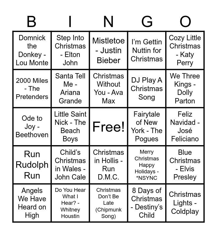 This bingo card has a free space and 97 words: Six Cups of Eggnog - Larry Costa, It Came Upon A Midnight Clear, Underneath the Tree - Kelly Clarkson, Little Saint Nick - The Beach Boys, Silver Bells, Snowman - Sia, Holiday Road - Kesha, Sleigh Ride, I Saw Three Ships, Happy Xmas (War Is Over), It’s the Most Wonderful Time of the Year, Merry Christmas - Ed Sheeran, Oh It’s Christmas! - Jordan Sparks, Run Rudolph Run, Driving Home For Christmas - Chris Rea, Domnick the Donkey - Lou Monte, Cozy Little Christmas - Katy Perry, The Holly and the Ivy, God Rest Ye Merry Gentlemen, It’s a Marshmallow World - Jo Stafford, Have Yourself A Merry Little Christmas, Jingle Bells, Hark! The Angels Sing, Joy to the World, Away In a Manger, Christmas Without You - Ava Max, Angels We Have Heard on High, Blue Christmas - Elvis Presley, Holly Jolly Christmas, Carol of the Bells, Santa Tell Me - Ariana Grande, I’m Gettin Nuttin for Christmas, Santa Claus Is Comin' to Town, Good King Wenceslas - Jennifer Jones, Christmas Don’t Be Late (Chipmunk Song), Christmas in Hollis - Run D.M.C., ¿Dónde Está Santa Claus? - Augie Rios, Santa Baby, Christmas Time Is Here, Ode to Joy - Beethoven, I Saw Mommy Kissing Santa Claus, Feliz Navidad - José Feliciano, It’s Beginning to Look a Lot Like Christmas, 8 Days of Christmas - Destiny’s Child, Child’s Christmas in Wales - John Cale, White Christmas - Bing Crosby, Christmas Rappin’ - Kurtis Blow, Silent Night, Wishlist - The Ready Set, I Wish It Could Be Christmas Everyday, Jingle Bell Rock, Welcome Christmas (Dahoo Dores), The Christmas Song (Merry Christmas to You), Grown-Up Christmas List - Amy Grant, This December - Ricky Montgomery, You Make It Feel Like Christmas - Gwen Stefani, All I Want for Christmas Is You, Step Into Christmas - Elton John, One More Sleep - Leona Lewis, Thank God It's Christmas - Queen, We Are The World - U.S.A. For Africa, Winter Wonderland, Christmas Tree Farm - Taylor Swift, Please Come Home for Christmas - Eagles, Happy Holidays, The Nutcracker Suite, Last Christmas, Hallelujah - Leonard Cohen, Let It Snow! Let It Snow! Let It Snow!, Do You Hear What I Hear? - Whitney Houstin, DJ Play A Christmas Song, Christmas (Baby Please Come Home) - Darlene Love, O Holy Night - Céline Dion, Rudolph the Red-Nosed Reindeer, Frosty the Snowman - Billy Idol, Little Drummer Boy, Here Comes Santa Claus, A Nonsense Christmas - Sabrina Carpenter, Fairytale of New York - The Pogues, Drunk On Christmas - Darren Criss, What Christmas Means to Me, We Three Kings - Dolly Parton, Christmas Wrapping - The Waitresses, Joyful Joyful We Adore Thee, My Favourite Time of Year - Pete Masitti, That Old Christmas Moon - Leon Redbone, Christmas Lights - Coldplay, O Come All Ye Faithful - Pentatonix, O Christmas Tree, Rockin' Around The Christmas Tree, Mistletoe - Justin Bieber, Wonderful Christmastime, I’ll Be Home - Meghan Trainor, Merry Christmas Happy Holidays - *NSYNC, 2000 Miles - The Pretenders, My Only Wish (This Year) - Britney Spears and ELF - Main theme.