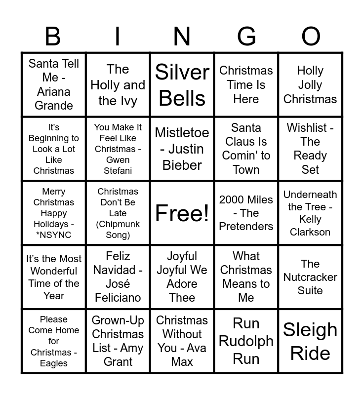 This bingo card has a free space and 97 words: It’s a Marshmallow World - Jo Stafford, Holiday Road - Kesha, That Old Christmas Moon - Leon Redbone, Christmas Don’t Be Late (Chipmunk Song), Step Into Christmas - Elton John, Here Comes Santa Claus, Snowman - Sia, One More Sleep - Leona Lewis, Away In a Manger, Ode to Joy - Beethoven, Jingle Bells, My Favourite Time of Year - Pete Masitti, Six Cups of Eggnog - Larry Costa, It’s the Most Wonderful Time of the Year, Frosty the Snowman - Billy Idol, Santa Tell Me - Ariana Grande, Holly Jolly Christmas, Christmas Rappin’ - Kurtis Blow, Let It Snow! Let It Snow! Let It Snow!, Happy Xmas (War Is Over), Welcome Christmas (Dahoo Dores), We Are The World - U.S.A. For Africa, Have Yourself A Merry Little Christmas, I Saw Three Ships, Christmas in Hollis - Run D.M.C., Mistletoe - Justin Bieber, Please Come Home for Christmas - Eagles, The Nutcracker Suite, Happy Holidays, Christmas Tree Farm - Taylor Swift, You Make It Feel Like Christmas - Gwen Stefani, Christmas Time Is Here, It Came Upon A Midnight Clear, Drunk On Christmas - Darren Criss, Christmas Without You - Ava Max, Joyful Joyful We Adore Thee, A Nonsense Christmas - Sabrina Carpenter, 8 Days of Christmas - Destiny’s Child, God Rest Ye Merry Gentlemen, Merry Christmas Happy Holidays - *NSYNC, Hark! The Angels Sing, Underneath the Tree - Kelly Clarkson, Carol of the Bells, Run Rudolph Run, Feliz Navidad - José Feliciano, Little Saint Nick - The Beach Boys, The Christmas Song (Merry Christmas to You), This December - Ricky Montgomery, ELF - Main theme, We Three Kings - Dolly Parton, Hallelujah - Leonard Cohen, Do You Hear What I Hear? - Whitney Houstin, Fairytale of New York - The Pogues, Merry Christmas - Ed Sheeran, I Saw Mommy Kissing Santa Claus, Christmas (Baby Please Come Home) - Darlene Love, Cozy Little Christmas - Katy Perry, The Holly and the Ivy, I Wish It Could Be Christmas Everyday, Santa Baby, Jingle Bell Rock, Thank God It's Christmas - Queen, Joy to the World, I’m Gettin Nuttin for Christmas, Rockin' Around The Christmas Tree, Silent Night, All I Want for Christmas Is You, Driving Home For Christmas - Chris Rea, White Christmas - Bing Crosby, Grown-Up Christmas List - Amy Grant, Santa Claus Is Comin' to Town, Christmas Wrapping - The Waitresses, O Holy Night - Céline Dion, Rudolph the Red-Nosed Reindeer, O Christmas Tree, Blue Christmas - Elvis Presley, O Come All Ye Faithful - Pentatonix, ¿Dónde Está Santa Claus? - Augie Rios, 2000 Miles - The Pretenders, DJ Play A Christmas Song, Good King Wenceslas - Jennifer Jones, Wishlist - The Ready Set, Little Drummer Boy, Christmas Lights - Coldplay, Wonderful Christmastime, Domnick the Donkey - Lou Monte, Sleigh Ride, Last Christmas, Child’s Christmas in Wales - John Cale, My Only Wish (This Year) - Britney Spears, Silver Bells, I’ll Be Home - Meghan Trainor, Winter Wonderland, What Christmas Means to Me, It’s Beginning to Look a Lot Like Christmas, Angels We Have Heard on High and Oh It’s Christmas! - Jordan Sparks.
