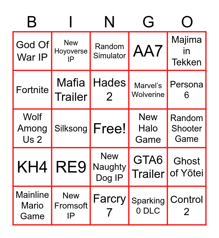 This bingo card has a free space and 24 words: RE9, New Fromsoft IP, Hades 2, Mainline Mario Game, Majima in Tekken, God Of War IP, Fortnite, New Hoyoverse IP, New Halo Game, New Naughty Dog IP, Marvel’s Wolverine, Wolf Among Us 2, GTA6 Trailer, Ghost of Yōtei, Mafia Trailer, Sparking 0 DLC, Random Shooter Game, Random Simulator, Persona 6, Silksong, Control 2, KH4, AA7 and Farcry 7.
