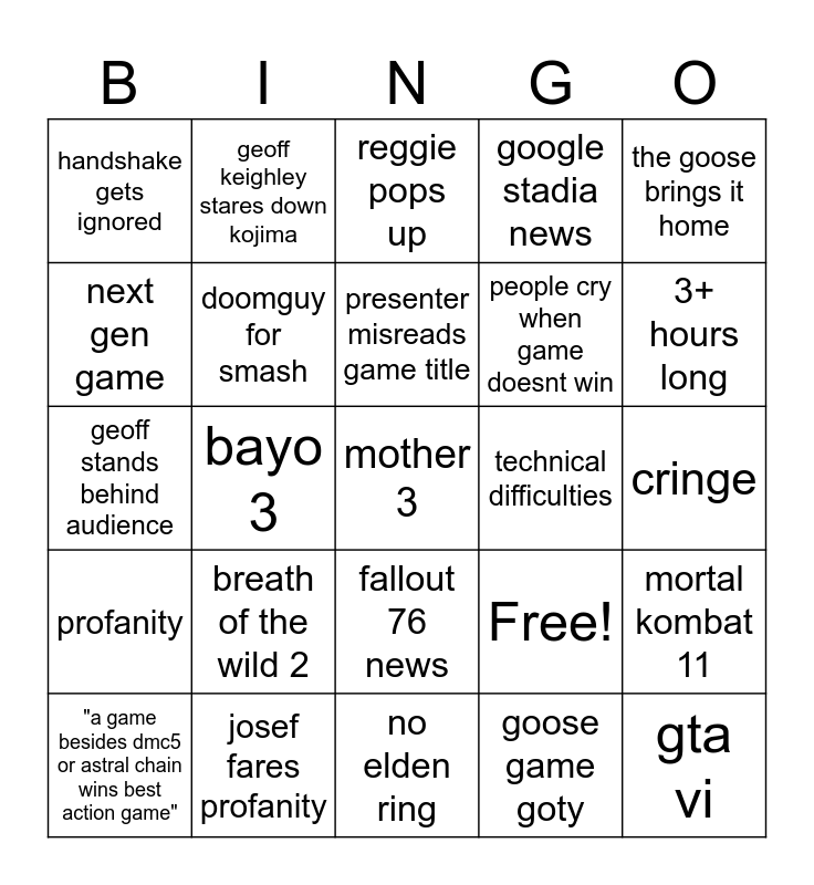 This bingo card has 25 words: breath of the wild 2, no elden ring, presenter misreads game title, "a game besides dmc5 or astral chain wins best action game", the goose brings it home, handshake gets ignored, next gen game, geoff keighley stares down kojima, technical difficulties, fallout 76 news, people cry when game doesnt win, geoff stands behind audience, Free!, mortal kombat 11, doomguy for smash, gta vi, cringe, reggie pops up, 3+ hours long, bayo 3, mother 3, josef fares profanity, profanity, google stadia news and goose game goty.