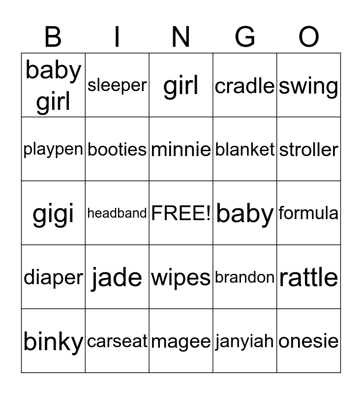 This bingo card has a free space and 24 words: jade, carseat, minnie, binky, swing, baby girl, playpen, sleeper, baby, wipes, blanket, gigi, brandon, rattle, booties, janyiah, formula, girl, stroller, headband, onesie, diaper, cradle and magee.