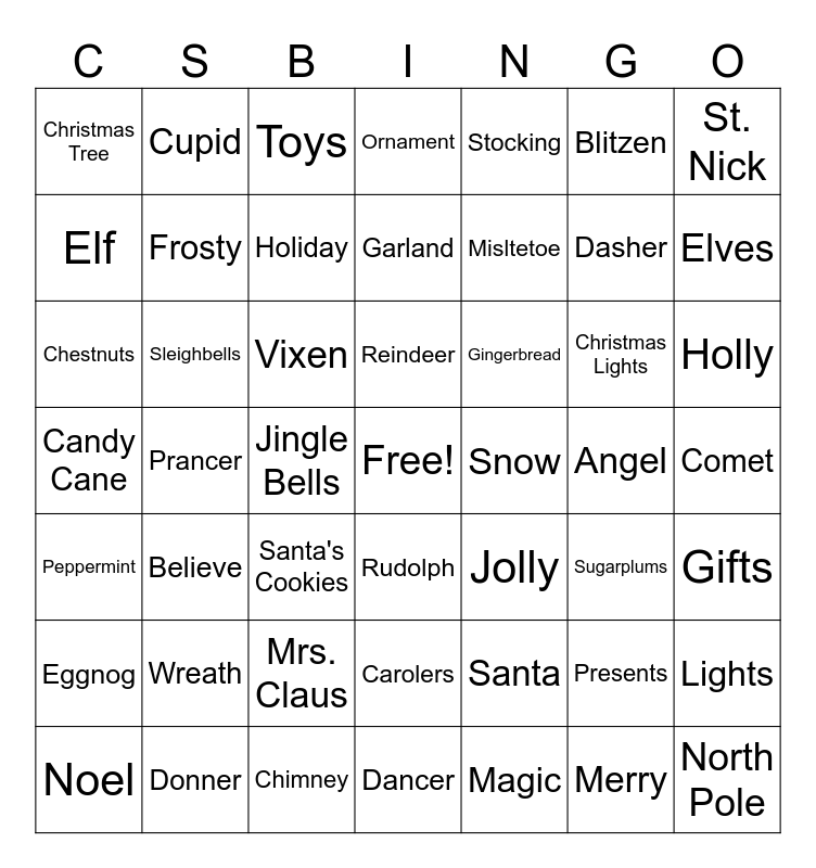 This bingo card has a free space and 48 words: Santa, Dasher, Dancer, Prancer, Vixen, Comet, Cupid, Donner, Blitzen, Rudolph, St. Nick, Ornament, Christmas Lights, Gingerbread, Eggnog, Angel, Elf, Elves, Presents, Stocking, Misltetoe, Jingle Bells, Christmas Tree, Frosty, Lights, Holiday, Holly, Noel, Reindeer, Sleighbells, Merry, Snow, Gifts, Wreath, Candy Cane, Jolly, Sugarplums, Chestnuts, Santa's Cookies, Mrs. Claus, Peppermint, North Pole, Toys, Chimney, Garland, Carolers, Believe and Magic.