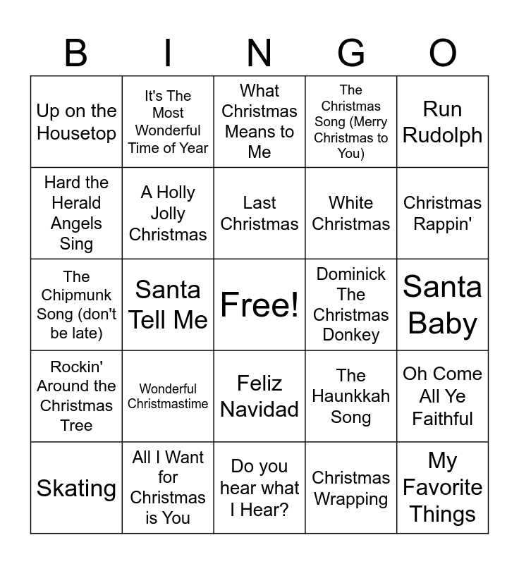 This bingo card has a free space and 34 words: This Christmas, Christmas Wrapping, Christmas in Hollis, Blue Christmas, Rockin' Around the Christmas Tree, A Holly Jolly Christmas, Run Rudolph, Skating, It's The Most Wonderful Time of Year, Jingle Bell Rock, Last Christmas, What Christmas Means to Me, Frosty the Snowman, You're a Mean One Mr. Grinch, Dominick The Christmas Donkey, Christmas Rappin', All I Want for Christmas is You, The Chipmunk Song (don't be late), Wonderful Christmastime, The Haunkkah Song, Feliz Navidad, Here Comes Santa Claus, Up on the Housetop, Santa Baby, Do you hear what I Hear?, My Favorite Things, The Christmas Song (Merry Christmas to You), Merry Christmas Baby, White Christmas, Hard the Herald Angels Sing, Joy to the World, Santa Tell Me, Oh Come All Ye Faithful and Christmas Time is Here.