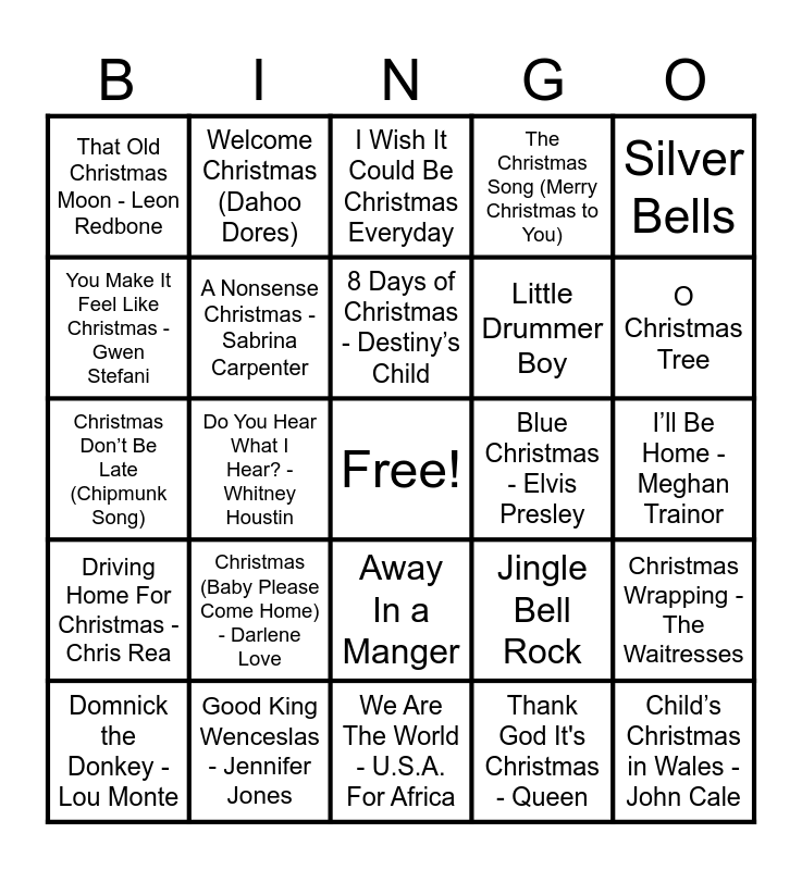 This bingo card has a free space and 97 words: Santa Claus Is Comin' to Town, Step Into Christmas - Elton John, Santa Tell Me - Ariana Grande, Do You Hear What I Hear? - Whitney Houstin, 2000 Miles - The Pretenders, Silent Night, Run Rudolph Run, Christmas Tree Farm - Taylor Swift, It’s a Marshmallow World - Jo Stafford, ELF - Main theme, Grown-Up Christmas List - Amy Grant, Happy Holidays, ¿Dónde Está Santa Claus? - Augie Rios, Driving Home For Christmas - Chris Rea, My Only Wish (This Year) - Britney Spears, That Old Christmas Moon - Leon Redbone, Silver Bells, Underneath the Tree - Kelly Clarkson, It’s the Most Wonderful Time of the Year, Feliz Navidad - José Feliciano, I Saw Three Ships, Merry Christmas Happy Holidays - *NSYNC, White Christmas - Bing Crosby, Let It Snow! Let It Snow! Let It Snow!, What Christmas Means to Me, 8 Days of Christmas - Destiny’s Child, Domnick the Donkey - Lou Monte, Christmas Wrapping - The Waitresses, Winter Wonderland, Rudolph the Red-Nosed Reindeer, A Nonsense Christmas - Sabrina Carpenter, The Christmas Song (Merry Christmas to You), Santa Baby, Christmas Without You - Ava Max, We Are The World - U.S.A. For Africa, Away In a Manger, Angels We Have Heard on High, This December - Ricky Montgomery, Snowman - Sia, Christmas Don’t Be Late (Chipmunk Song), Hark! The Angels Sing, I’ll Be Home - Meghan Trainor, O Come All Ye Faithful - Pentatonix, Thank God It's Christmas - Queen, Christmas (Baby Please Come Home) - Darlene Love, Happy Xmas (War Is Over), I Saw Mommy Kissing Santa Claus, Ode to Joy - Beethoven, Fairytale of New York - The Pogues, Christmas in Hollis - Run D.M.C., Have Yourself A Merry Little Christmas, It’s Beginning to Look a Lot Like Christmas, It Came Upon A Midnight Clear, Wonderful Christmastime, Drunk On Christmas - Darren Criss, God Rest Ye Merry Gentlemen, Christmas Time Is Here, Welcome Christmas (Dahoo Dores), Please Come Home for Christmas - Eagles, I’m Gettin Nuttin for Christmas, Jingle Bells, Joyful Joyful We Adore Thee, Last Christmas, O Holy Night - Céline Dion, Joy to the World, One More Sleep - Leona Lewis, Frosty the Snowman - Billy Idol, Here Comes Santa Claus, Mistletoe - Justin Bieber, Good King Wenceslas - Jennifer Jones, Little Drummer Boy, Little Saint Nick - The Beach Boys, Holly Jolly Christmas, Rockin' Around The Christmas Tree, All I Want for Christmas Is You, Hallelujah - Leonard Cohen, Carol of the Bells, Cozy Little Christmas - Katy Perry, Blue Christmas - Elvis Presley, Oh It’s Christmas! - Jordan Sparks, Christmas Rappin’ - Kurtis Blow, O Christmas Tree, Holiday Road - Kesha, Christmas Lights - Coldplay, Merry Christmas - Ed Sheeran, The Nutcracker Suite, Child’s Christmas in Wales - John Cale, My Favourite Time of Year - Pete Masitti, Six Cups of Eggnog - Larry Costa, Wishlist - The Ready Set, I Wish It Could Be Christmas Everyday, We Three Kings - Dolly Parton, The Holly and the Ivy, Jingle Bell Rock, You Make It Feel Like Christmas - Gwen Stefani, Sleigh Ride and DJ Play A Christmas Song.