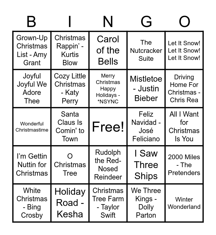 This bingo card has a free space and 97 words: 8 Days of Christmas - Destiny’s Child, Run Rudolph Run, Thank God It's Christmas - Queen, Santa Claus Is Comin' to Town, What Christmas Means to Me, Underneath the Tree - Kelly Clarkson, Christmas Without You - Ava Max, O Come All Ye Faithful - Pentatonix, Christmas in Hollis - Run D.M.C., Welcome Christmas (Dahoo Dores), Please Come Home for Christmas - Eagles, A Nonsense Christmas - Sabrina Carpenter, Domnick the Donkey - Lou Monte, I’m Gettin Nuttin for Christmas, Joy to the World, Grown-Up Christmas List - Amy Grant, Let It Snow! Let It Snow! Let It Snow!, Angels We Have Heard on High, Ode to Joy - Beethoven, Hallelujah - Leonard Cohen, I’ll Be Home - Meghan Trainor, Have Yourself A Merry Little Christmas, Good King Wenceslas - Jennifer Jones, That Old Christmas Moon - Leon Redbone, Frosty the Snowman - Billy Idol, Merry Christmas Happy Holidays - *NSYNC, White Christmas - Bing Crosby, 2000 Miles - The Pretenders, The Holly and the Ivy, Silver Bells, Cozy Little Christmas - Katy Perry, The Nutcracker Suite, Wishlist - The Ready Set, It Came Upon A Midnight Clear, Christmas Tree Farm - Taylor Swift, Rudolph the Red-Nosed Reindeer, Jingle Bells, Christmas (Baby Please Come Home) - Darlene Love, Here Comes Santa Claus, Wonderful Christmastime, Step Into Christmas - Elton John, All I Want for Christmas Is You, Little Drummer Boy, We Three Kings - Dolly Parton, O Christmas Tree, It’s Beginning to Look a Lot Like Christmas, God Rest Ye Merry Gentlemen, DJ Play A Christmas Song, You Make It Feel Like Christmas - Gwen Stefani, ELF - Main theme, Christmas Wrapping - The Waitresses, Happy Holidays, Christmas Don’t Be Late (Chipmunk Song), My Only Wish (This Year) - Britney Spears, Jingle Bell Rock, Little Saint Nick - The Beach Boys, Child’s Christmas in Wales - John Cale, Christmas Rappin’ - Kurtis Blow, Six Cups of Eggnog - Larry Costa, My Favourite Time of Year - Pete Masitti, It’s a Marshmallow World - Jo Stafford, Away In a Manger, We Are The World - U.S.A. For Africa, Silent Night, Sleigh Ride, This December - Ricky Montgomery, Christmas Lights - Coldplay, Merry Christmas - Ed Sheeran, Fairytale of New York - The Pogues, Holiday Road - Kesha, Mistletoe - Justin Bieber, Happy Xmas (War Is Over), Oh It’s Christmas! - Jordan Sparks, Do You Hear What I Hear? - Whitney Houstin, I Wish It Could Be Christmas Everyday, One More Sleep - Leona Lewis, O Holy Night - Céline Dion, Santa Tell Me - Ariana Grande, Feliz Navidad - José Feliciano, Last Christmas, Holly Jolly Christmas, Driving Home For Christmas - Chris Rea, Christmas Time Is Here, Drunk On Christmas - Darren Criss, Snowman - Sia, ¿Dónde Está Santa Claus? - Augie Rios, Winter Wonderland, Blue Christmas - Elvis Presley, The Christmas Song (Merry Christmas to You), I Saw Mommy Kissing Santa Claus, Carol of the Bells, Santa Baby, Rockin' Around The Christmas Tree, I Saw Three Ships, Joyful Joyful We Adore Thee, Hark! The Angels Sing and It’s the Most Wonderful Time of the Year.