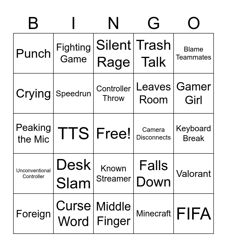 This bingo card has a free space and 24 words: Desk Slam, Curse Word, Controller Throw, Foreign, Blame Teammates, Punch, Crying, Fighting Game, Camera Disconnects, Known Streamer, Leaves Room, Peaking the Mic, Falls Down, Valorant, Speedrun, Minecraft, Keyboard Break, Silent Rage, Gamer Girl, TTS, FIFA, Unconventional Controller, Trash Talk and Middle Finger.