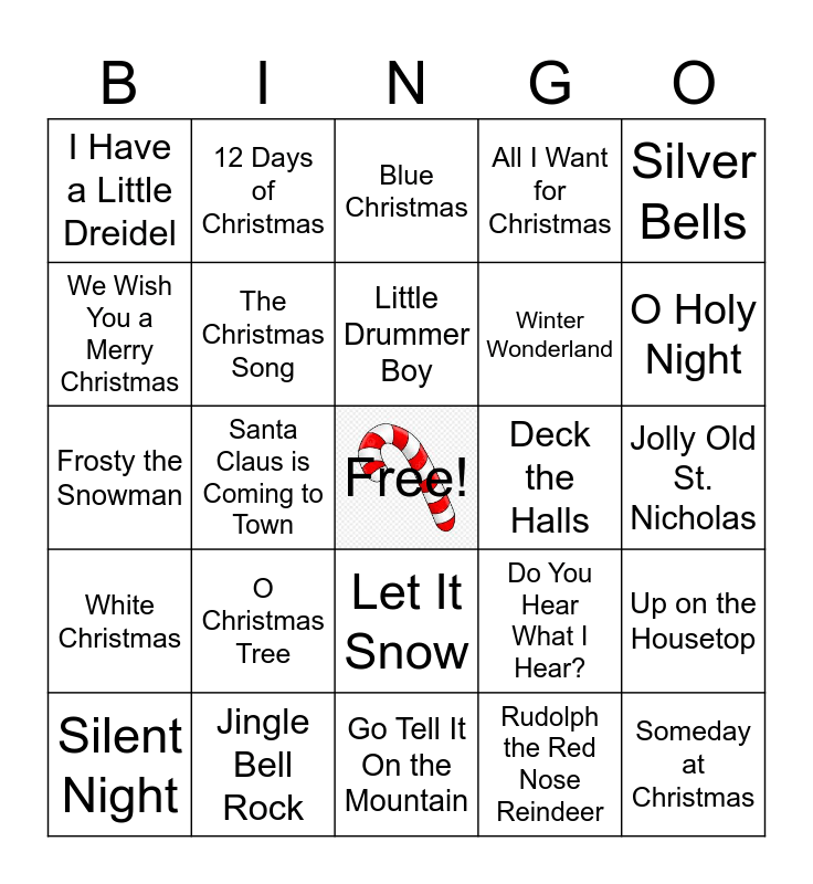This bingo card has a free space and 24 words: O Christmas Tree, Jingle Bell Rock, Little Drummer Boy, Silent Night, Silver Bells, I Have a Little Dreidel, We Wish You a Merry Christmas, 12 Days of Christmas, Deck the Halls, Let It Snow, Winter Wonderland, Frosty the Snowman, Do You Hear What I Hear?, Up on the Housetop, The Christmas Song, Rudolph the Red Nose Reindeer, Jolly Old St. Nicholas, Blue Christmas, O Holy Night, Santa Claus is Coming to Town, Someday at Christmas, White Christmas, All I Want for Christmas and Go Tell It On the Mountain.