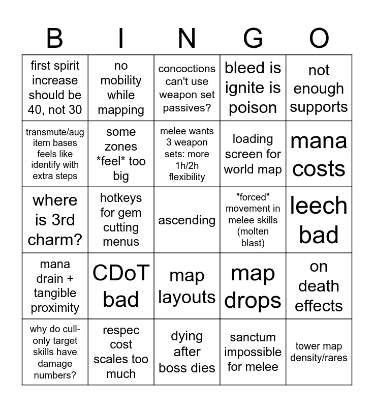 This bingo card has a free space and 24 words: CDoT bad, respec cost scales too much, melee wants 3 weapon sets: more 1h/2h flexibility, why do cull-only target skills have damage numbers?, not enough supports, first spirit increase should be 40, not 30, transmute/aug item bases feels like identify with extra steps, no mobility while mapping, "forced" movement in melee skills (molten blast), map layouts, loading screen for world map, where is 3rd charm?, map drops, on death effects, some zones *feel* too big, sanctum impossible for melee, leech bad, concoctions can't use weapon set passives?, mana costs, hotkeys for gem cutting menus, tower map density/rares, mana drain + tangible proximity, bleed is ignite is poison and dying after boss dies.