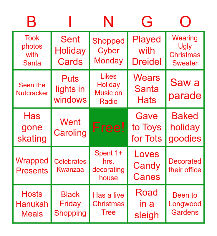 This bingo card has a free space and 29 words: Watches Hallmark Movies, Black Friday Shopping, Shopped Cyber Monday, Bought Holiday Stamps, Wearing Ugly Christmas Sweater, Took photos with Santa, Puts lights in windows, Likes Holiday Music on Radio, Gave to Toys for Tots, Decorated their office, Hosts Hanukah Meals, Went Caroling, Road in a sleigh, Been to Longwood Gardens, Has gone skating, Watches NYC Ball Drop, Has a live Christmas Tree, Loves Candy Canes, Saw a parade, Wrapped Presents, Celebrates Kwanzaa, Drank a Holiday Drink, Wears Santa Hats, Baked holiday goodies, Seen the Nutcracker, Sent Holiday Cards, Spent 1+ hrs. decorating house, Played with Dreidel and Wears Holiday Jewelry.