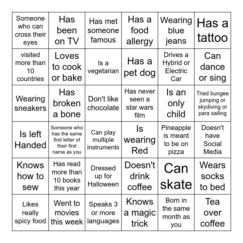 This bingo card has 36 words: Doesn't drink coffee, Dressed up for Halloween, Knows a magic trick, visited more than 10 countries, Is left Handed, Has never seen a star wars film, Loves to cook or bake, Speaks 3 or more languages, Wearing blue jeans, Can skate, Can dance or sing, Has a food allergy, Wears socks to bed, Has broken a bone, Has a pet dog, Someone who can cross their eyes, Knows how to sew, Is an only child, Wearing sneakers, Has met someone famous, Don't like chocolate, Someone who has the same first letter of their first name as you, Is wearing Red, Can play multiple instruments, Pineapple is meant to be on pizza, Has been on TV, Drives a Hybrid or Electric Car, Went to movies this week, Is a vegetarian, Has a tattoo, Tea over coffee, Likes really spicy food, Doesn't have Social Media, Tried bungee jumping or skydiving or para sailing, Has read more than 10 books this year and Born in the same month as you.