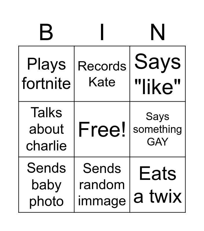 This bingo card has a free space and 8 words: Says something GAY, Says "like", Records Kate, Sends baby photo, Plays fortnite, Eats a twix, Talks about charlie and Sends random immage.