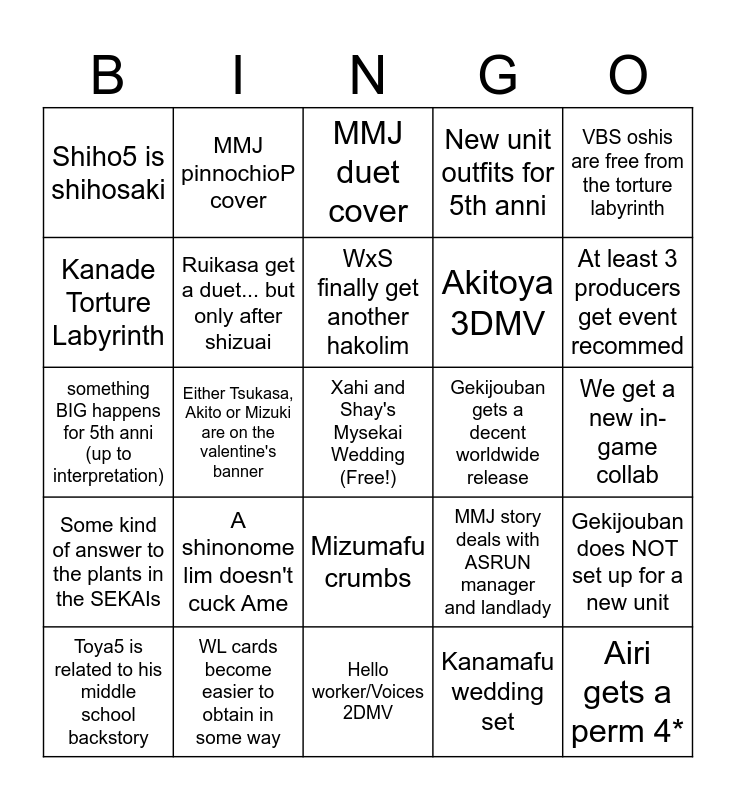 This bingo card has a free space and 24 words: A shinonome lim doesn't cuck Ame, WL cards become easier to obtain in some way, WxS finally get another hakolim, Toya5 is related to his middle school backstory, VBS oshis are free from the torture labyrinth, Shiho5 is shihosaki, Kanade Torture Labyrinth, MMJ pinnochioP cover, Gekijouban gets a decent worldwide release, Mizumafu crumbs, Akitoya 3DMV, something BIG happens for 5th anni (up to interpretation), MMJ story deals with ASRUN manager and landlady, Gekijouban does NOT set up for a new unit, Ruikasa get a duet... but only after shizuai, Kanamafu wedding set, We get a new in-game collab, MMJ duet cover, At least 3 producers get event recommed, Either Tsukasa, Akito or Mizuki are on the valentine's banner, Airi gets a perm 4*, Some kind of answer to the plants in the SEKAIs, New unit outfits for 5th anni and Hello worker/Voices 2DMV.