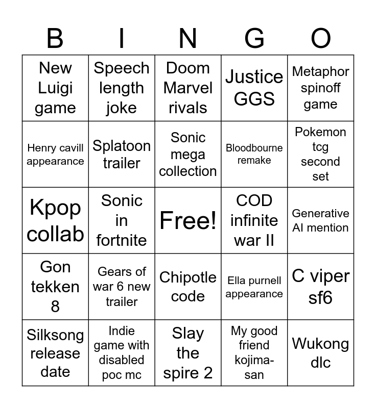 This bingo card has a free space and 24 words: Gears of war 6 new trailer, Indie game with disabled poc mc, Sonic mega collection, Silksong release date, Metaphor spinoff game, New Luigi game, Henry cavill appearance, Speech length joke, COD infinite war II, Chipotle code, Bloodbourne remake, Kpop collab, Ella purnell appearance, C viper sf6, Splatoon trailer, My good friend kojima-san, Generative AI mention, Doom Marvel rivals, Pokemon tcg second set, Sonic in fortnite, Wukong dlc, Gon tekken 8, Justice GGS and Slay the spire 2.