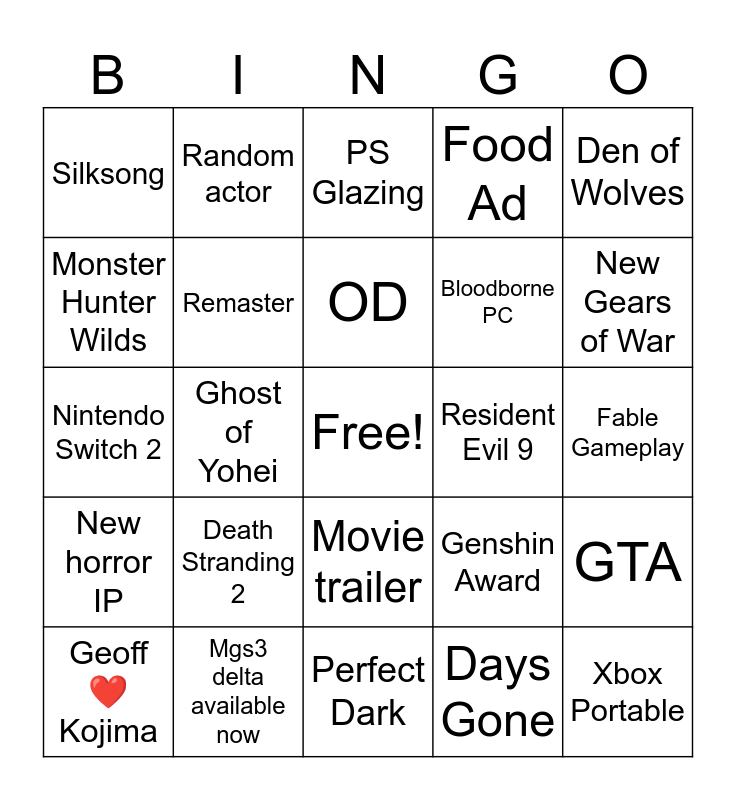 This bingo card has a free space and 24 words: Death Stranding 2, Mgs3 delta available now, OD, Geoff ❤️ Kojima, Den of Wolves, Silksong, Monster Hunter Wilds, Random actor, Resident Evil 9, Movie trailer, Bloodborne PC, Nintendo Switch 2, Genshin Award, GTA, Remaster, Days Gone, Fable Gameplay, PS Glazing, New Gears of War, Ghost of Yohei, Xbox Portable, New horror IP, Food Ad and Perfect Dark.
