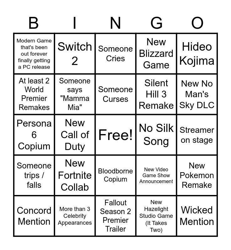 This bingo card has a free space and 24 words: New Fortnite Collab, More than 3 Celebrity Appearances, Someone Curses, Concord Mention, Hideo Kojima, Modern Game that's been out forever finally getting a PC release, At least 2 World Premier Remakes, Switch 2, No Silk Song, Bloodborne Copium, Silent Hill 3 Remake, Persona 6 Copium, New Video Game Show Announcement, New Pokemon Remake, Someone says "Mamma Mia", New Hazelight Studio Game (It Takes Two), Streamer on stage, Someone Cries, New No Man's Sky DLC, New Call of Duty, Wicked Mention, Someone trips / falls, New Blizzard Game and Fallout Season 2 Premier Trailer.