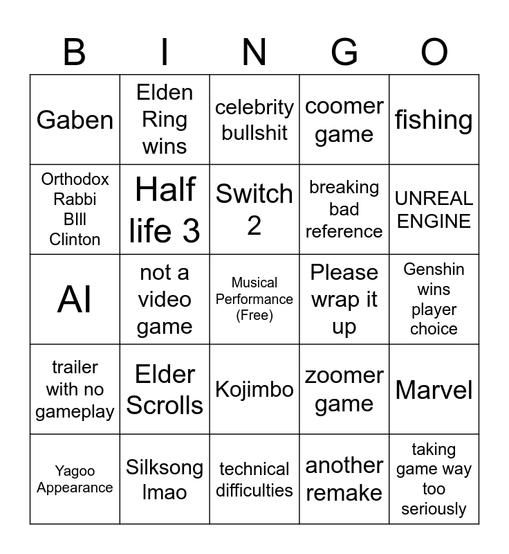 This bingo card has a free space and 24 words: Elder Scrolls, Silksong lmao, Switch 2, Yagoo Appearance, fishing, Gaben, Orthodox Rabbi BIll Clinton, Elden Ring wins, Please wrap it up, Kojimbo, breaking bad reference, AI, zoomer game, Marvel, Half life 3, another remake, Genshin wins player choice, celebrity bullshit, UNREAL ENGINE, not a video game, taking game way too seriously, trailer with no gameplay, coomer game and technical difficulties.