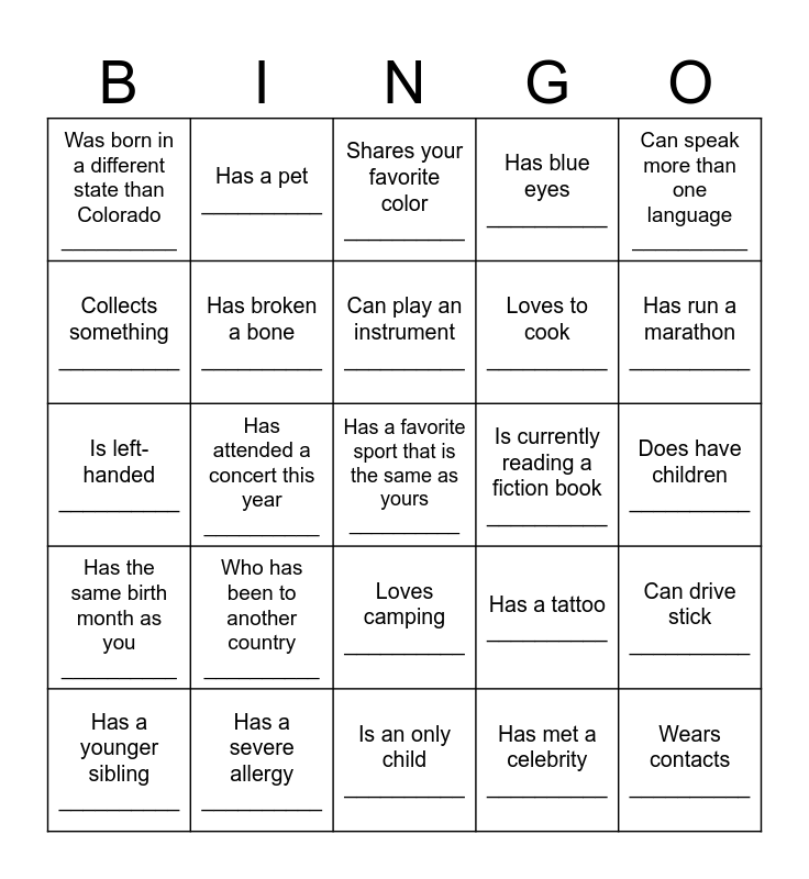 This bingo card has 32 words: Has met a celebrity __________, Likes pineapple on pizza __________, Has attended a concert this year __________, Has been skydiving __________, Has the same birth month as you __________, Has broken a bone __________, Can speak more than one language __________, Can drive stick __________, Has a pet __________, Wears contacts __________, Can play an instrument __________, Shares your favorite color __________, Has a talent not listed on this Bingo sheet __________, Plays a sport __________, Is currently reading a fiction book __________, Loves working in accounting __________, Has a younger sibling __________, Is left-handed __________, Loves camping __________, Who has been to another country __________, Has a tattoo __________, Doesn’t have children __________, Does have children __________, Has a severe allergy __________, Has a favorite sport that is the same as yours __________, Has blue eyes __________, Loves to cook __________, Collects something __________, Was born in a different state than Colorado __________, Is an only child __________, Has worked with Nutrien for over 5 years __________ and Has run a marathon __________.
