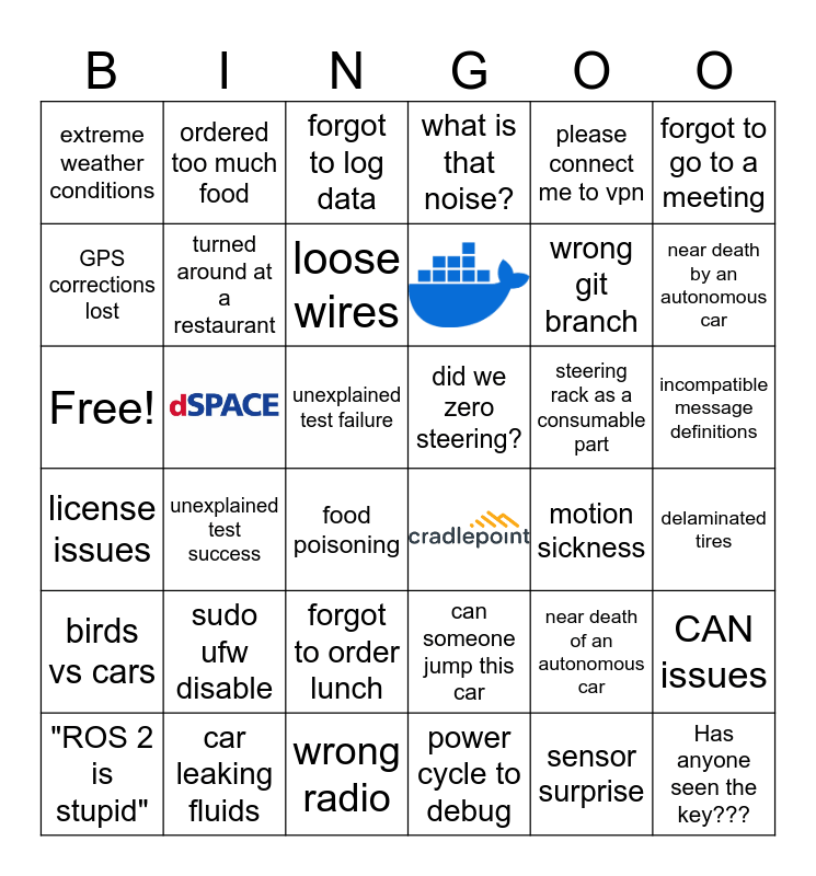 This bingo card has 3 images and 33 words: can someone jump this car, forgot to order lunch, power cycle to debug, GPS corrections lost, license issues, did we zero steering?, turned around at a restaurant, wrong radio, please connect me to vpn, near death of an autonomous car, near death by an autonomous car, what is that noise?, CAN issues, extreme weather conditions, birds vs cars, steering rack as a consumable part, Free!, forgot to log data, unexplained test failure, unexplained test success, food poisoning, motion sickness, ordered too much food, wrong git branch, car leaking fluids, loose wires, forgot to go to a meeting, Has anyone seen the key???, "ROS 2 is stupid", delaminated tires, incompatible message definitions, sudo ufw disable and sensor surprise.