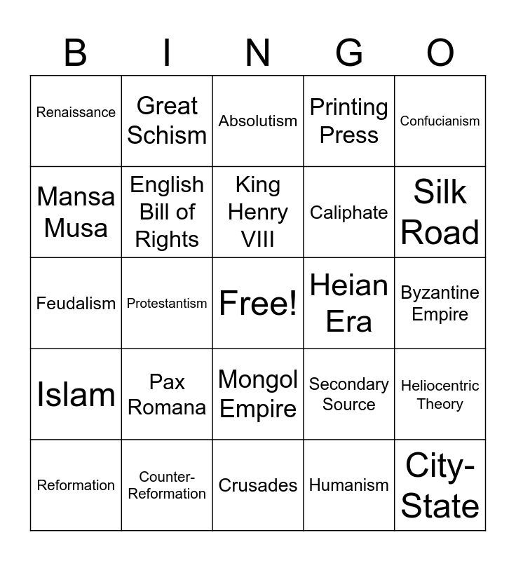 This bingo card has a free space and 29 words: Reformation, Magna Carta, Protestantism, Civilization, Renaissance, Absolutism, English Bill of Rights, Pax Romana, Heian Era, Counter-Reformation, Byzantine Empire, City-State, Crusades, Humanism, Silk Road, Primary Source, Mongol Empire, Islam, Confucianism, Feudalism, Secondary Source, Scientific Revolution, Caliphate, Mansa Musa, Printing Press, Great Schism, Heliocentric Theory, King Henry VIII and Oliver Cromwell.