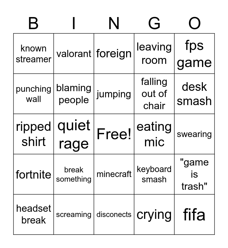 This bingo card has a free space and 24 words: break something, screaming, jumping, headset break, fps game, known streamer, punching wall, valorant, eating mic, minecraft, falling out of chair, ripped shirt, keyboard smash, "game is trash", blaming people, crying, swearing, foreign, desk smash, quiet rage, fifa, fortnite, leaving room and disconects.
