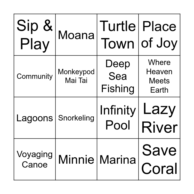 This bingo card has 16 words: Minnie, Lazy River, Turtle Town, Sip & Play, Lagoons, Moana, Infinity Pool, Marina, Community, Monkeypod Mai Tai, Voyaging Canoe, Place of Joy, Snorkeling, Where Heaven Meets Earth, Deep Sea Fishing and Save Coral.