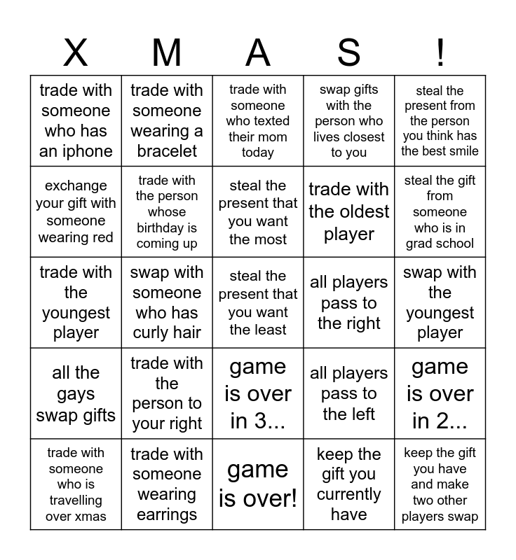 This bingo card has a free space and 24 words: trade with the person to your right, trade with someone wearing earrings, steal the present that you want the most, trade with someone who is travelling over xmas, steal the present from the person you think has the best smile, trade with someone who has an iphone, exchange your gift with someone wearing red, trade with someone wearing a bracelet, all players pass to the right, game is over in 3..., trade with the oldest player, trade with the youngest player, all players pass to the left, game is over in 2..., trade with the person whose birthday is coming up, keep the gift you currently have, swap with the youngest player, trade with someone who texted their mom today, steal the gift from someone who is in grad school, swap with someone who has curly hair, keep the gift you have and make two other players swap, all the gays swap gifts, swap gifts with the person who lives closest to you and game is over!.
