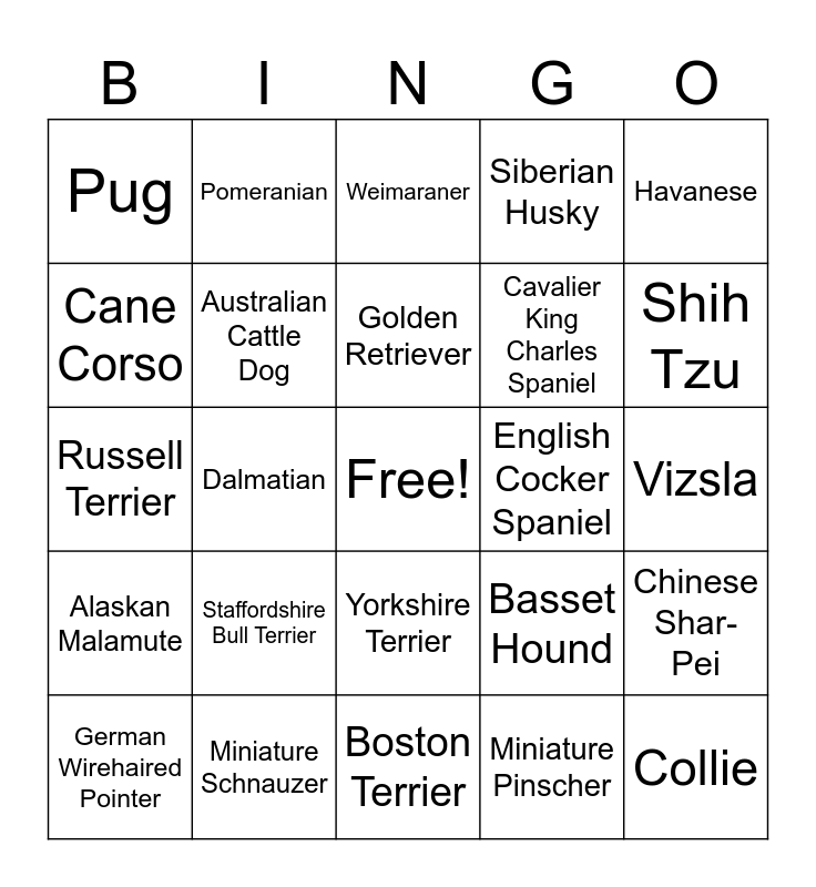 This bingo card has a free space and 75 words: French Bulldog, Labrador Retriever, Golden Retriever, German Shepherd Dog, Poodle, Dachshund, Bulldog, Beagle, Rottweiler, German Shorthaired Pointer, Pembroke Welsh Corgi, Australian Shepherd, Yorkshire Terrier, Cavalier King Charles Spaniel, Doberman Pinscher, Cane Corso, Miniature Schnauzer, Boxer, Great Dane, Shih Tzu, Bernese Mountain Dog, Pomeranian, Boston Terrier, Siberian Husky, Havanese, Shetland Sheepdog, English Springer Spaniel, Brittany, Miniature American Shepherd, Cocker Spaniel, Border Collie, Chihuahua, Belgian Malinois, Basset Hound, Vizsla, Pug, Maltese, Mastiff, English Cocker Spaniel, Collie, Rhodesian Ridgeback, Newfoundland, West Highland White Terrier, Bichon Frise, Papillion, Shiba Inu, Dalmatian, Weimaraner, Portuguese Water Dog, Samoyed, Whippet, Australian Cattle Dog, Bloodhound, Chesapeake Bay Retriever, Saint Bernard, Giant Schnauzer, Wirehaired Pointing Griffon, Akita, Scottish Terrier, Bullmastiff, German Wirehaired Pointer, Italian Greyhound, Cardigan Welsh Corgi, Great Pyrenees, Bull Terrier, Russell Terrier, Airedale Terrier, Cairn Terrier, Soft Coated Wheaten Terrier, Chinese Shar-Pei, Alaskan Malamute, Staffordshire Bull Terrier, Irish Wolfhound, Miniature Pinscher and Boykin Spaniel.