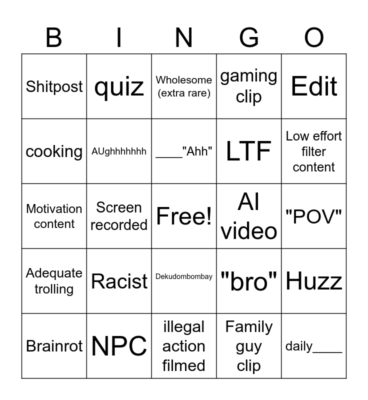 This bingo card has a free space and 24 words: Racist, NPC, ____"Ahh", Brainrot, Edit, Shitpost, cooking, quiz, AI video, Dekudombombay, LTF, Motivation content, "bro", Huzz, AUghhhhhhh, Family guy clip, "POV", Wholesome (extra rare), Low effort filter content, Screen recorded, daily____, Adequate trolling, gaming clip and illegal action filmed.