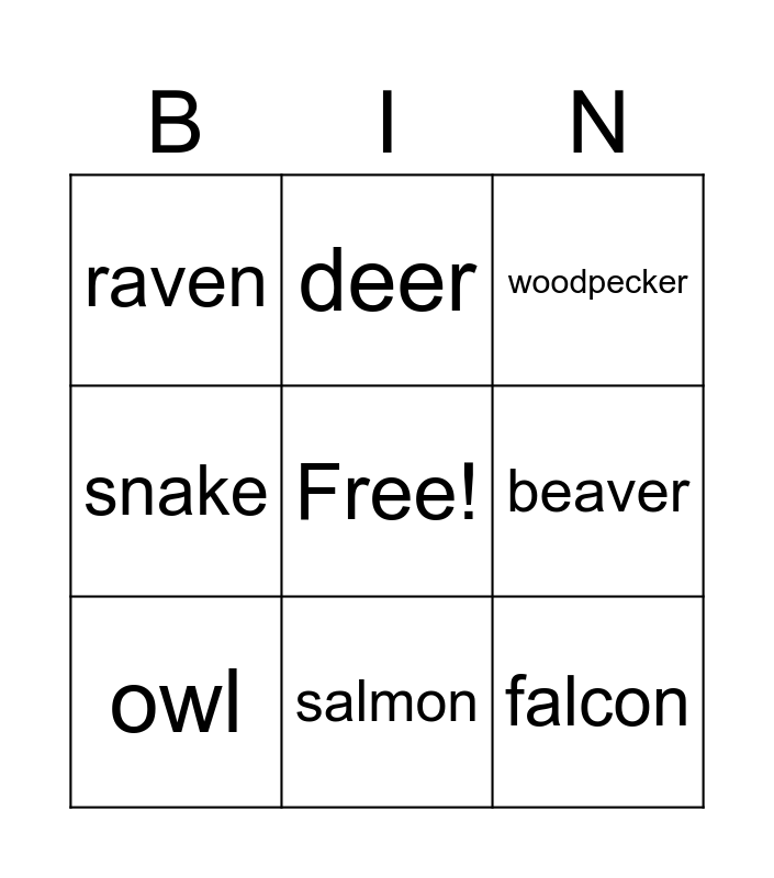 This bingo card has a free space and 12 words: Otter, wolf, falcon, beaver, deer, woodpecker, salmon, bear, raven, snake, owl and snow goose.