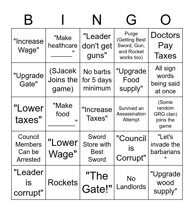 This bingo card has a free space and 24 words: "Leader is corrupt", "Lower Wage", No barbs for 5 days minimum, No Landlords, Doctors Pay Taxes, "Increase Wage", "Make healthcare ______", "Leader don't get guns", Survived an Assassination Attempt, (Some random GRG clan) joins the game, "Lower taxes", (SJacek Joins the game), "Council is Corrupt", "Let's invade the barbarians ", "Upgrade Gate", Rockets, "The Gate!", Purge (Getting Best Sword, Gun, and Rocket works too), All sign words being said at once, Council Members Can be Arrested, "Make food _______", Sword Store with Best Sword, "Upgrade Food supply" and "Upgrade wood supply".