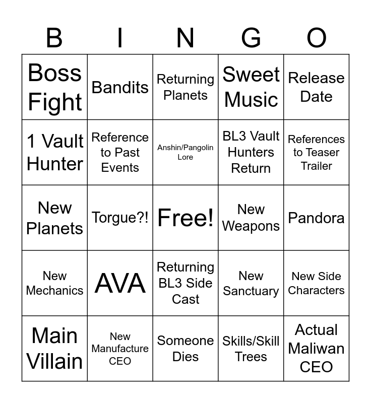 This bingo card has a free space and 24 words: AVA, New Manufacture CEO, Anshin/Pangolin Lore, Main Villain, Release Date, Boss Fight, 1 Vault Hunter, Bandits, New Weapons, Returning BL3 Side Cast, BL3 Vault Hunters Return, New Planets, New Sanctuary, New Side Characters, Reference to Past Events, Skills/Skill Trees, Pandora, Returning Planets, References to Teaser Trailer, Torgue?!, Actual Maliwan CEO, New Mechanics, Sweet Music and Someone Dies.