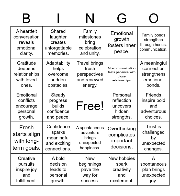 This bingo card has a free space and 24 words: Confidence sparks meaningful and exciting connections., A bold decision leads to personal growth., Travel brings fresh perspectives and renewed energy., Creative pursuits inspire joy and fulfillment., Family bonds strengthen through honest communication., A heartfelt conversation reveals emotional clarity., Gratitude deepens relationships with loved ones., Shared laughter creates unforgettable memories., Personal reflection uncovers hidden strengths., A spontaneous adventure brings unexpected happiness., Miscommunication tests patience with close relationships., Emotional conflicts encourage personal growth., Overthinking complicates important decisions., Trust is challenged by unexpected changes., Adaptability helps overcome sudden obstacles., New hobbies spark creativity and excitement., Friends inspire bold and adventurous choices., Family milestones bring celebration and unity., A meaningful connection strengthens emotional bonds., Steady progress builds confidence and peace., A spontaneous plan brings unexpected joy., Fresh starts align with long-term goals., Emotional growth fosters inner peace. and New beginnings pave the way for success..