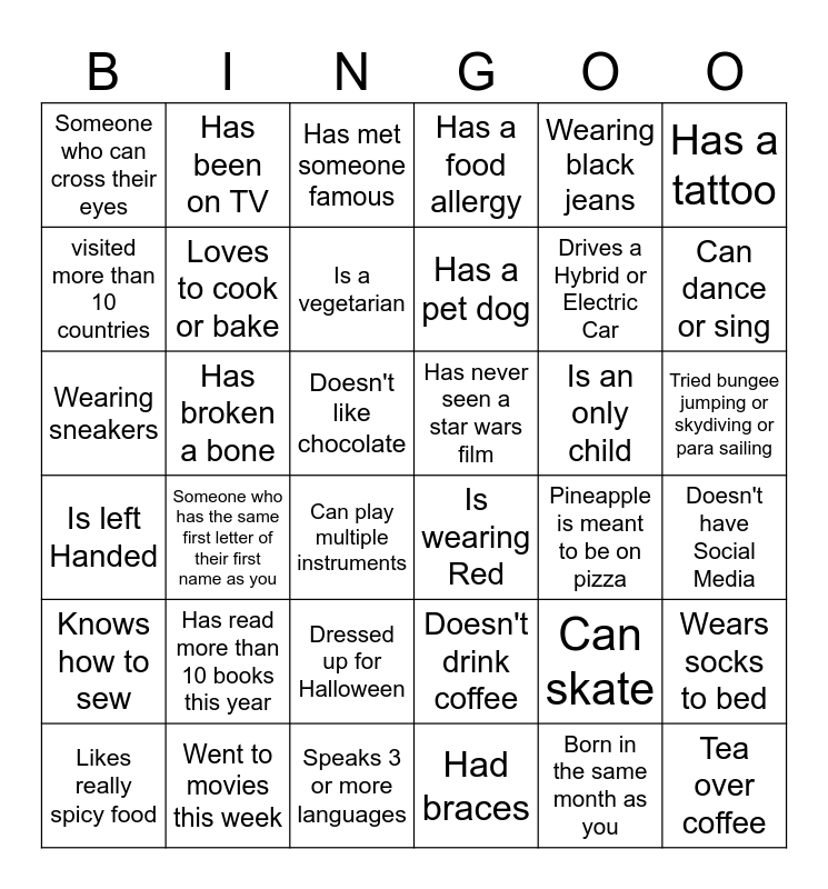 This bingo card has 36 words: Doesn't drink coffee, Dressed up for Halloween, Had braces, visited more than 10 countries, Is left Handed, Has never seen a star wars film, Loves to cook or bake, Speaks 3 or more languages, Wearing black jeans, Can skate, Can dance or sing, Has a food allergy, Wears socks to bed, Has broken a bone, Has a pet dog, Someone who can cross their eyes, Knows how to sew, Is an only child, Wearing sneakers, Has met someone famous, Doesn't like chocolate, Someone who has the same first letter of their first name as you, Is wearing Red, Can play multiple instruments, Pineapple is meant to be on pizza, Has been on TV, Drives a Hybrid or Electric Car, Went to movies this week, Is a vegetarian, Has a tattoo, Tea over coffee, Likes really spicy food, Doesn't have Social Media, Tried bungee jumping or skydiving or para sailing, Has read more than 10 books this year and Born in the same month as you.