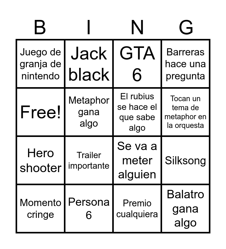 This bingo card has 16 words: Persona 6, Silksong, GTA 6, Juego de granja de nintendo, Hero shooter, Jack black, Se va a meter alguien, Premio cualquiera, Free!, Metaphor gana algo, Momento cringe, Barreras hace una pregunta, Trailer importante, Tocan un tema de metaphor en la orquesta, El rubius se hace el que sabe algo and Balatro gana algo.