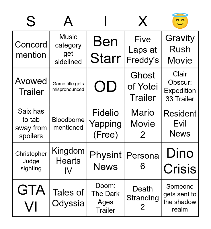 This bingo card has a free space and 24 words: GTA VI, Kingdom Hearts IV, OD, Death Stranding 2, Gravity Rush Movie, Concord mention, Music category get sidelined, Ben Starr, Mario Movie 2, Resident Evil News, Saix has to tab away from spoilers, Game title gets mispronounced, Persona 6, Dino Crisis, Avowed Trailer, Tales of Odyssia, Doom: The Dark Ages Trailer, Five Laps at Freddy's, Clair Obscur: Expedition 33 Trailer, Christopher Judge sighting, Bloodborne mentioned, Physint News, Ghost of Yotei Trailer and Someone gets sent to the shadow realm.