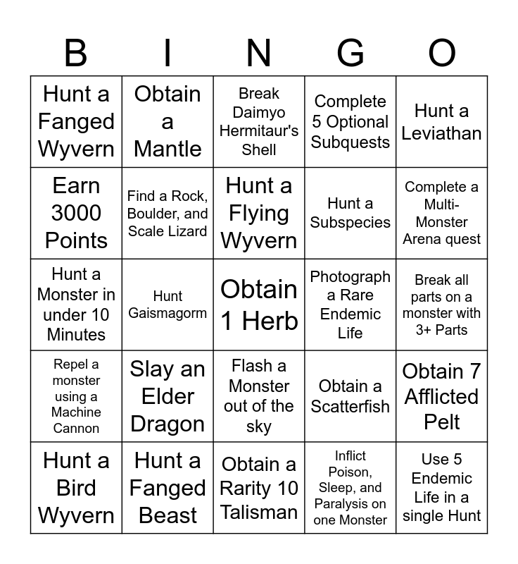This bingo card has a free space and 24 words: Slay an Elder Dragon, Hunt a Fanged Beast, Hunt a Flying Wyvern, Hunt a Bird Wyvern, Hunt a Leviathan, Hunt a Fanged Wyvern, Earn 3000 Points, Obtain a Mantle, Photograph a Rare Endemic Life, Flash a Monster out of the sky, Hunt a Subspecies, Hunt a Monster in under 10 Minutes, Obtain a Scatterfish, Obtain 7 Afflicted Pelt, Find a Rock, Boulder, and Scale Lizard, Inflict Poison, Sleep, and Paralysis on one Monster, Break all parts on a monster with 3+ Parts, Break Daimyo Hermitaur's Shell, Complete a Multi-Monster Arena quest, Hunt Gaismagorm, Use 5 Endemic Life in a single Hunt, Repel a monster using a Machine Cannon, Complete 5 Optional Subquests and Obtain a Rarity 10 Talisman.