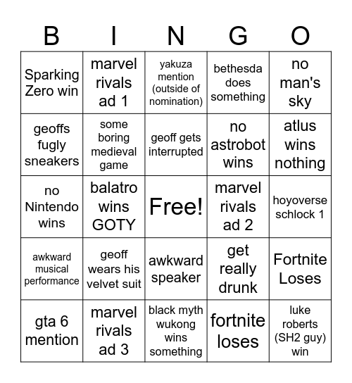 This bingo card has a free space and 25 words: geoff wears his velvet suit, black myth wukong wins something, geoff gets interrupted, gta 6 mention, no man's sky, Sparking Zero win, geoffs fugly sneakers, marvel rivals ad 1, marvel rivals ad 2, awkward speaker, no astrobot wins, no Nintendo wins, get really drunk, Fortnite Loses, some boring medieval game, erdtree wins more than 2 awards, hoyoverse schlock 1, yakuza mention (outside of nomination), atlus wins nothing, balatro wins GOTY, luke roberts (SH2 guy) win, marvel rivals ad 3, awkward musical performance, bethesda does something and fortnite loses.