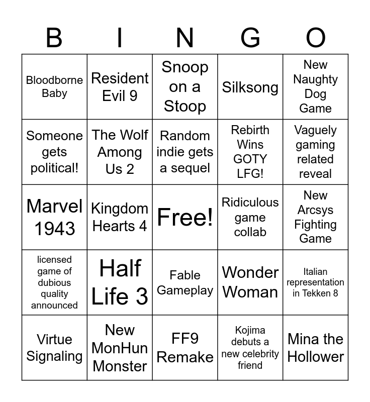 This bingo card has a free space and 24 words: Half Life 3, New MonHun Monster, Random indie gets a sequel, Virtue Signaling, New Naughty Dog Game, Bloodborne Baby, Someone gets political!, Resident Evil 9, Ridiculous game collab, Fable Gameplay, Rebirth Wins GOTY LFG!, Marvel 1943, Wonder Woman, Italian representation in Tekken 8, The Wolf Among Us 2, Kojima debuts a new celebrity friend, New Arcsys Fighting Game, Snoop on a Stoop, Vaguely gaming related reveal, Kingdom Hearts 4, Mina the Hollower, licensed game of dubious quality announced, Silksong and FF9 Remake.