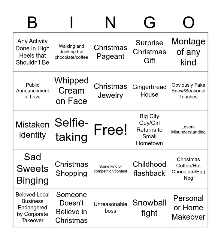 This bingo card has a free space and 38 words: Tree Lighting, Bad Accent, Making Snowman, Whipped Cream on Face, Christmas Coffee/Hot Chocolate/Egg Nog, Christmas Shopping, Christmas Jewelry, Double Date, Montage of any kind, Gingerbread House, Selfie-taking, Surprise Christmas Gift, Personal or Home Makeover, Lovers' Misunderstanding, Public Announcement of Love, Sad Sweets Binging, Romantic Rivalry/Love Triangle, Christmas Pageant, Supernatural Christmas Element, Big City Guy/Girl Returns to Small Hometown, Any Activity Done in High Heels that Shouldn't Be, Someone Doesn't Believe in Christmas, Obviously Fake Snow/Seasonal Touches, Beloved Local Business Endangered by Corporate Takeover, Near-Kiss, Unreasonable boss, Dead cell phone/no charger, Carriage ride, A dance event or dance sequence, Cookie decorating, Leads hate each other at first, Some kind of competition/contest, Snowball fight, Walking and drinking hot chocolate/coffee, Egg nog, Childhood flashback, Mistaken identity and Someone says "aboot".