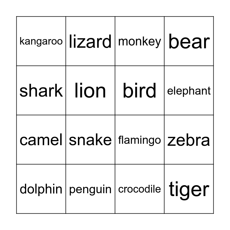 This bingo card has 16 words: penguin, zebra, monkey, kangaroo, camel, lizard, flamingo, crocodile, shark, lion, dolphin, bear, snake, elephant, bird and tiger.