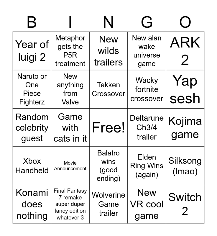 This bingo card has a free space and 24 words: Konami does nothing, Movie Announcement, Tekken Crossover, New VR cool game, ARK 2, Year of luigi 2, Metaphor gets the P5R treatment, New wilds trailers, Deltarune Ch3/4 trailer, Kojima game, Random celebrity guest, New anything from Valve, Elden Ring Wins (again), Silksong (lmao), Naruto or One Piece Fighterz, Final Fantasy 7 remake super duper fancy edition whatever 3, Wolverine Game trailer, New alan wake universe game, Yap sesh, Xbox Handheld, Game with cats in it, Balatro wins (good ending), Wacky fortnite crossover and Switch 2.